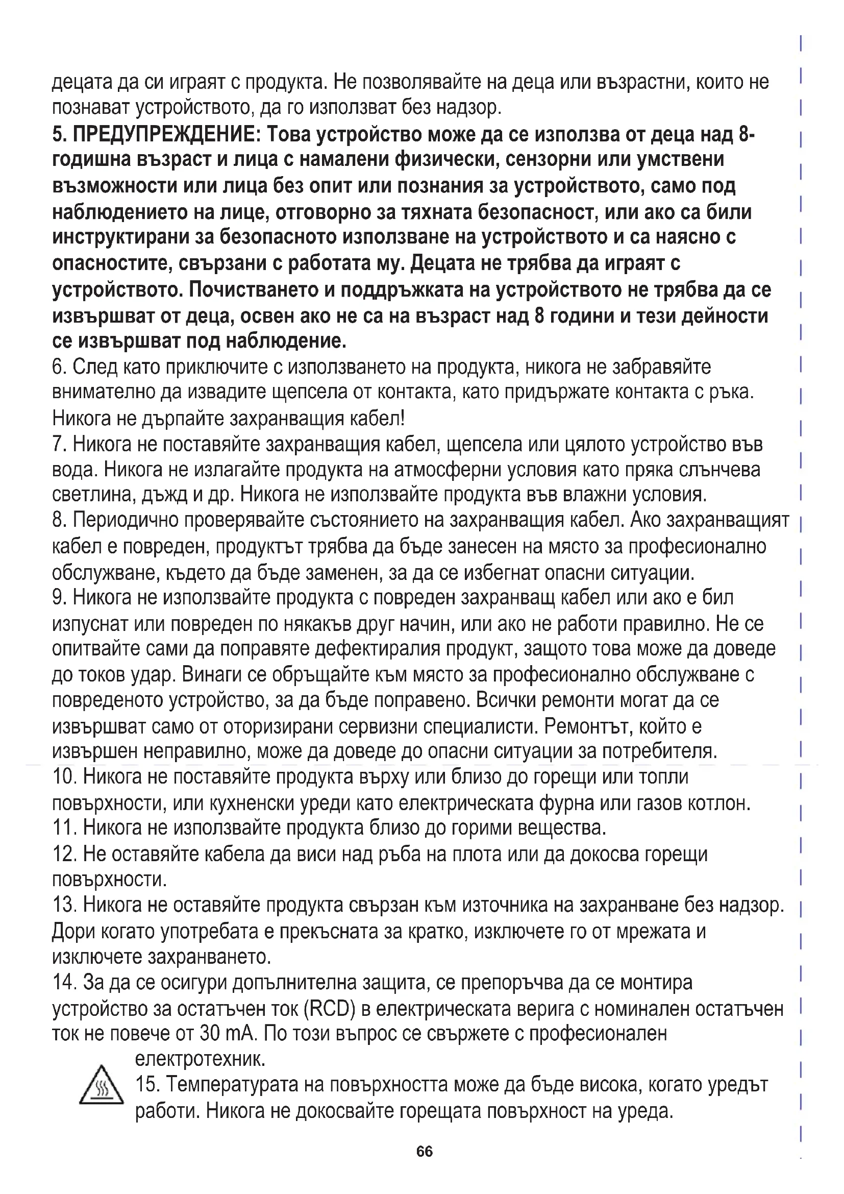 годишна възраст и лица с намалени физически, сензорни или умствени възможности или лица без опит или познания за устройството, само под наблюдението на лице, отговорно за тяхната безопасност, или ако са били инструктирани за безопасното използване на устройството и са наясно с опасностите, свързани с работата му. Децата не трябва да играят с устройството. Почистването и поддръжката на устройството не трябва да се извършват от деца, освен ако не са на възраст над 8 години и тези дейности се извършват под наблюдение.