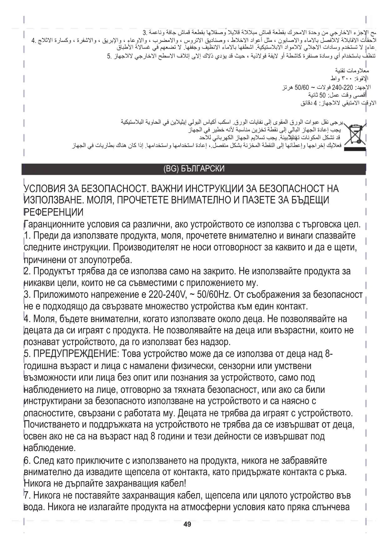 ТЕХНИЧЕСКИ ДАННИ Източник на захранване: 220-240V ~ 50Hz Мощност: 300W Макс: 500W Максимално време на работа: 50 сек. Никога не поставяйте моторната част във вода и пазете от мокри повърности. Преди почистване винаги изключвайте и изваждайте щепсела от контакта. 4. Измийте отделните аксесоари в сапунена вода (напр. приставките на пасатора, бъркалка, купа, кана, ножчета, трошачка за лед и т.н). Не използвайте кърпи за полиране за пластмасовите материали. Изплакнете ги с чиста вода и ги подсушете. Не ги мийте в съдомиялната машина. Време за почивка на устройството: 4 минути