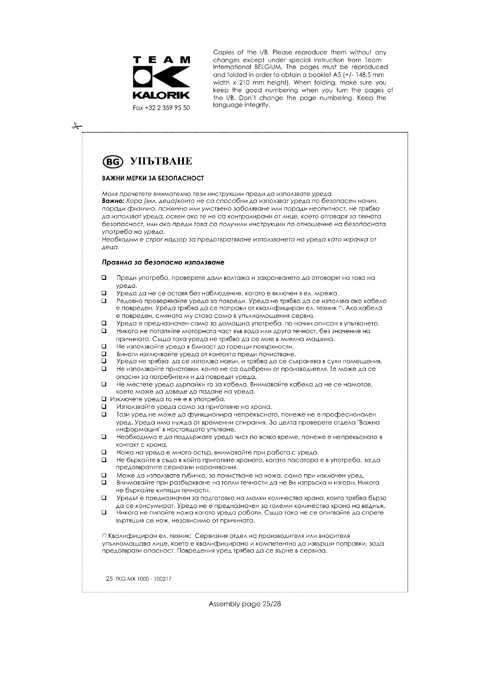 Винаги изключвайте уреда преди почистване. Моторния блок трябва да се почиства само с влажна кърпа. Разглобете пасаторната приставка от основата на моторната част. Символа ▼ на мотора трябва да завършва на отворен на приставката. Измийте пасаторната приставка под течаща вода веднага след употреба. Ако приставката е много мръсна, може да се измие в топла сапунена вода. НЕ МИЙТЕ МЕТАЛНАТА ЧАСТ В МИЯЛНА МАШИНА. Химикалите използвани в миялната машина ще оставят следи и петна по повърхността. Внимателно изсушете приставката след измиване. НИКОГА НЕ ПОТАПАЙТЕ МОТОРНАТА ЧАСТ ВЪВ ВОДА ИЛИ ДРУГА ТЕЧНОСТ. ЗАЩИТА НА ОКОЛНАТА СРЕДА – ДИРЕКТИВА 2002/96/EC За защита на околната среда и човешкото здраве, отпадъчното електрическо и електронно оборудване трябва да се съхранява в съответствие със специални правила, които засягат доставчика и потребителя. Поради тази причина, ако Вашия уред има символ на табелката или опаковката, то същия не трябва да се изхвърля заедно с общия боклук. Потребителя има право да занесе уреда до мястото, където се събиране такъв отпадък, който се рециклира, преработва или се използва за други цели съгласно директивата. Copies of the I/B. Please reproduce them without any changes except under special instruction from Team International BELGIUM. The pages must be reproduced and folded in order to obtain a booklet A5 (+/- 148.5 mm width x 210 mm height). When folding, make sure you keep the good numbering when you turn the pages of the I/B. Don’t change the page numbering. Keep the language integrity.