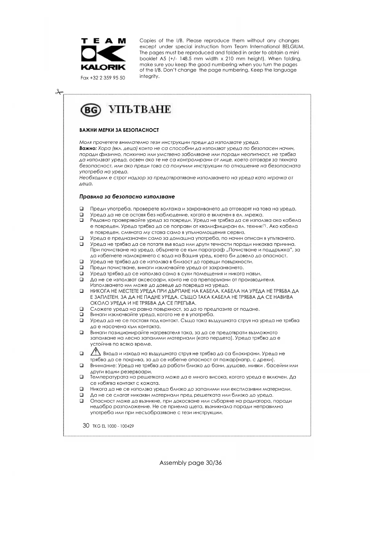 . Ако кабела е повреден, смяната му става само в упълномощения сервиз. Уреда е предназначен само за домашна употреба, по начин описан в упътването. Уреда не трябва да се потапя във вода или други течности поради никаква причина. При почистване на уреда, обърнете се към параграф „Почистване и поддръжка”, за да избегнете намокрянето с вода на Вашия уред, което би довело до опасност. Уреда не трябва да се използва в близост до горещи повърхности. Преди почистване, винаги изключвайте уреда от захранването. Уреда трябва да се използва само в сухи помещения и никога навън. Да не се използват аксесоари, които не са препоръчани от производителя. Използването им може да доведе до повреда на уреда. НИКОГА НЕ МЕСТЕТЕ УРЕДА ПРИ ДЪРПАНЕ НА КАБЕЛА. КАБЕЛА НА УРЕДА НЕ ТРЯБВА ДА Е ЗАПЛЕТЕН, ЗА ДА НЕ ПАДНЕ УРЕДА. СЪЩО ТАКА КАБЕЛА НЕ ТРЯБВА ДА СЕ НАВИВА ОКОЛО УРЕДА И НЕ ТРЯБВА ДА СЕ ПРЕГЪВА. Сложете уреда на равна повърхност, за да го предпазите от падане. Винаги изключвайте уреда, когато не е в употреба. Уреда да не се поставя под контакт. Също така въздушната струя на уреда не трябва да е насочена към контакта. Винаги позиционирайте нагревателя така, за да се предотврати възможното запалване на лесно запалими материали (като пердета). Уреда трябва да е устойчив по всяко време. Входа и изхода на въздушната струя не трябва да са блокирани. Уреда не трябва да се покрива, за да се избегне опасност от пожар(напр. с дрехи). Внимание: Уреда не трябва да работи близко до бани, душове, мивки , басейни или други водни резервоари. Температурата на решетката може да е много висока, когато уреда е включен. Да се избягва контакт с кожата. Никога да не се използва уреда близко до запалими или експлозивни материали. Да не се слагат никакви материали пред решетката или близко до уреда. Опасност може да възникне, при докосване или събаряне на радиатора, поради недобро разположение. Не се приема щета, възникнала поради неправилна употреба или при несъобразяване с тези инструкции.Copies of the I/B. Please reproduce them without any changes except under special instruction from Team International BELGIUM. The pages must be reproduced and folded in order to obtain a mini booklet A5 (+/- 148.5 mm width x 210 mm height). When folding, make sure you keep the good numbering when you turn the pages of the I/B. Don’t change the page numbering. Keep the language integrity.