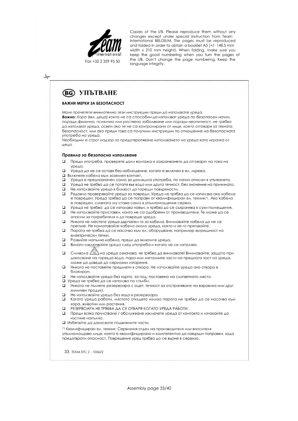 ЗАЩИТА НА ОКОЛНАТА СРЕДА – ДИРЕКТИВА 2002/96/EC За защита на околната среда и човешкото здраве, отпадъчното електрическо и електронно оборудване трябва да се съхранява в съответствие със специални правила, които засягат доставчика и потребителя. Поради тази причина, ако Вашия уред има символ на табелката или опаковката, то същия не трябва да се изхвърля заедно с общия боклук. Потребителя има право да занесе уреда до мястото, където се събиране такъв отпадък, който се рециклира, преработва или се използва за други цели съгласно директивата. Copies of the I/B. Please reproduce them without any changes except under special instruction from Team International BELGIUM. The pages must be reproduced and folded in order to obtain a booklet A5 (+/- 148.5 mm width x 210 mm height). When folding, make sure you keep the good numbering when you turn the pages of the I/B. Don’t change the page numbering. Keep the language integrity.