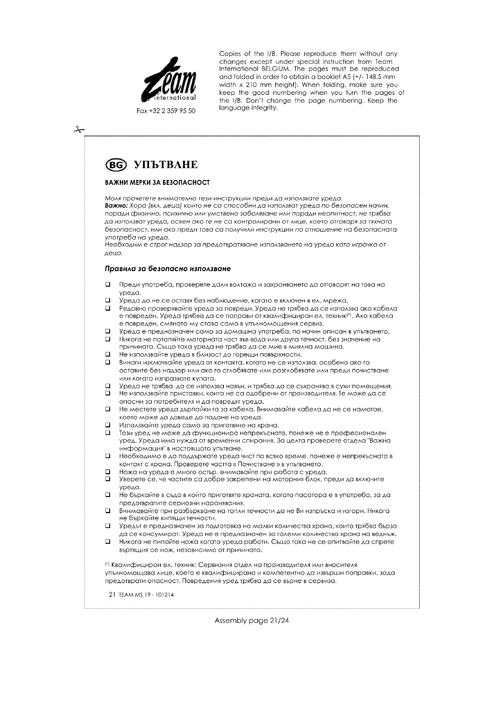Винаги изключвайте уреда преди почистване. Моторния блок трябва да се почиства само с влажна кърпа. За да свалите пасаторната приставка, натиснете 2 бутона за освобождаване и леко дръпнете леко приставката. Измийте пасаторната приставка под течаща вода веднага след употреба. Ако приставката е много мръсна, може да се измие в топла сапунена вода. Внимателно изсушете приставката след измиване. НИКОГА НЕ ПОТАПАЙТЕ МОТОРНАТА ЧАСТ ВЪВ ВОДА ИЛИ ДРУГА ТЕЧНОСТ. ЗАЩИТА НА ОКОЛНАТА СРЕДА – ДИРЕКТИВА 2002/96/EC За защита на околната среда и човешкото здраве, отпадъчното електрическо и електронно оборудване трябва да се съхранява в съответствие със специални правила, които засягат доставчика и потребителя. Поради тази причина, ако Вашия уред има символ на табелката или опаковката, то същия не трябва да се изхвърля заедно с общия боклук. Потребителя има право да занесе уреда до мястото, където се събиране такъв отпадък, който се рециклира, преработва или се използва за други цели съгласно директивата. Copies of the I/B. Please reproduce them without any changes except under special instruction from Team International BELGIUM. The pages must be reproduced and folded in order to obtain a booklet A5 (+/- 148.5 mm width x 210 mm height). When folding, make sure you keep the good numbering when you turn the pages of the I/B. Don’t change the page numbering. Keep the language integrity.