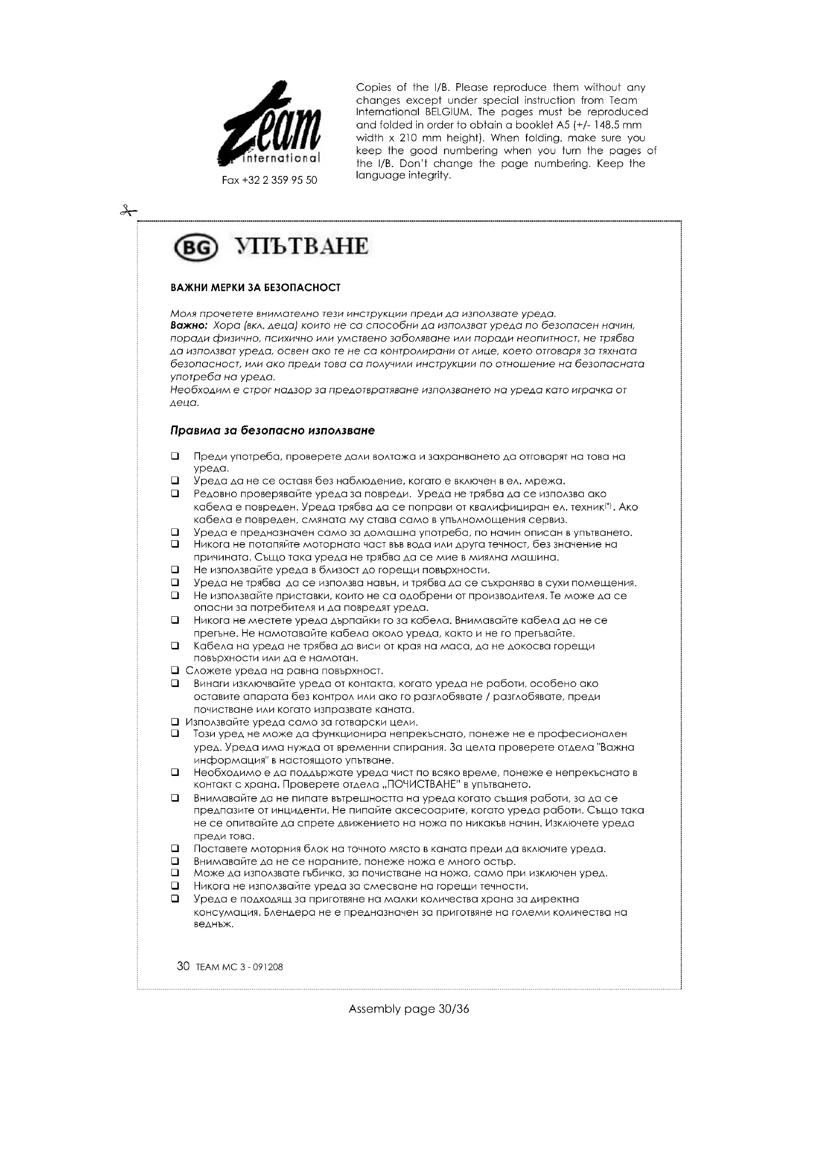 За по-лесно почистване, можете да разглобите частите, които са в контакт с храната. ЗАЩИТА НА ОКОЛНАТА СРЕДА – ДИРЕКТИВА 2002/96/EC За защита на околната среда и човешкото здраве, отпадъчното електрическо и електронно оборудване трябва да се съхранява в съответствие със специални правила, които засягат доставчика и потребителя. Поради тази причина, ако Вашия уред има символ на табелката или опаковката, то същия не трябва да се изхвърля заедно с общия боклук. Потребителя има право да занесе уреда до мястото, където се събиране такъв отпадък, който се рециклира, преработва или се използва за други цели съгласно директивата. Copies of the I/B. Please reproduce them without any changes except under special instruction from Team International BELGIUM. The pages must be reproduced and folded in order to obtain a booklet A5 (+/- 148.5 mm width x 210 mm height). When folding, make sure you keep the good numbering when you turn the pages of the I/B. Don’t change the page numbering. Keep the language integrity.