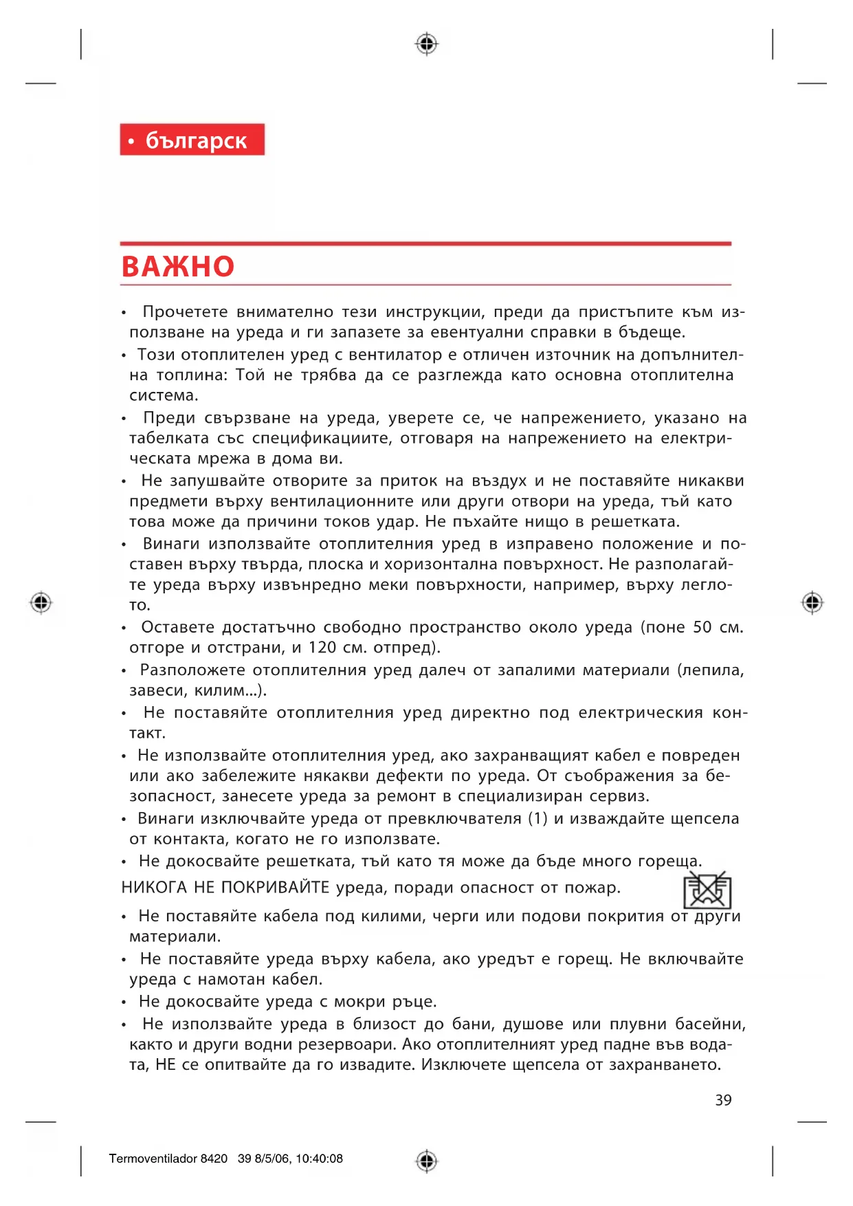 - Не използвайте отоплителния уред, ако захранващият кабел е повреден или ако забележите някакви дефекти по уреда. От съображения за безопасност, занесете уреда за ремонт в специализиран сервис.