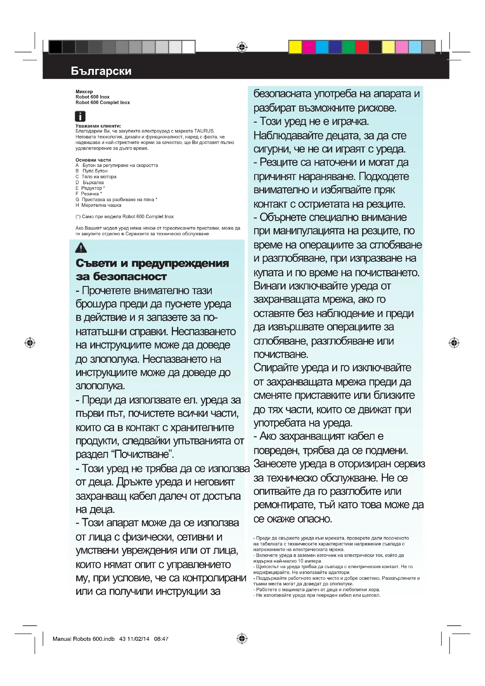 10 35 g Tăiaţi în cubuleţe de 1 cm şi striviţi până obţineţi textura dorită 3 s Manual Robots 600.indb 42 11/02/14 08:47Миксер Robot 600 Inox Robot 600 Complet Inox Уважаеми клиенти: Благодарим Ви, че закупихте електроуред с марката TAURUS. Неговата технология, дизайн и функционалност, наред с факта, че надвишава и най-стриктните норми за качество, ще Ви доставят пълно удовлетворение за дълго време. Основни части A Бутон за регулиране на скоростта B Пулс бутон C Тяло на мотора D Бъркалка E Редуктор * F Резачка * G Приставка за разбиване на пяна * H Мерителна чашка (*) Само при модела Robot 600 Complet Inox Ако Вашият модел уред няма някои от гореописаните приставки, може да ги закупите отделно в Сервизите за техническо обслужване. Съвети и предупреждения за безопасност - Прочетете внимателно тази брошура преди да пуснете уреда в действие и я запазете за по- нататъшни справки. Неспазването на инструкциите може да доведе до злополука. Неспазването на инструкциите може да доведе до