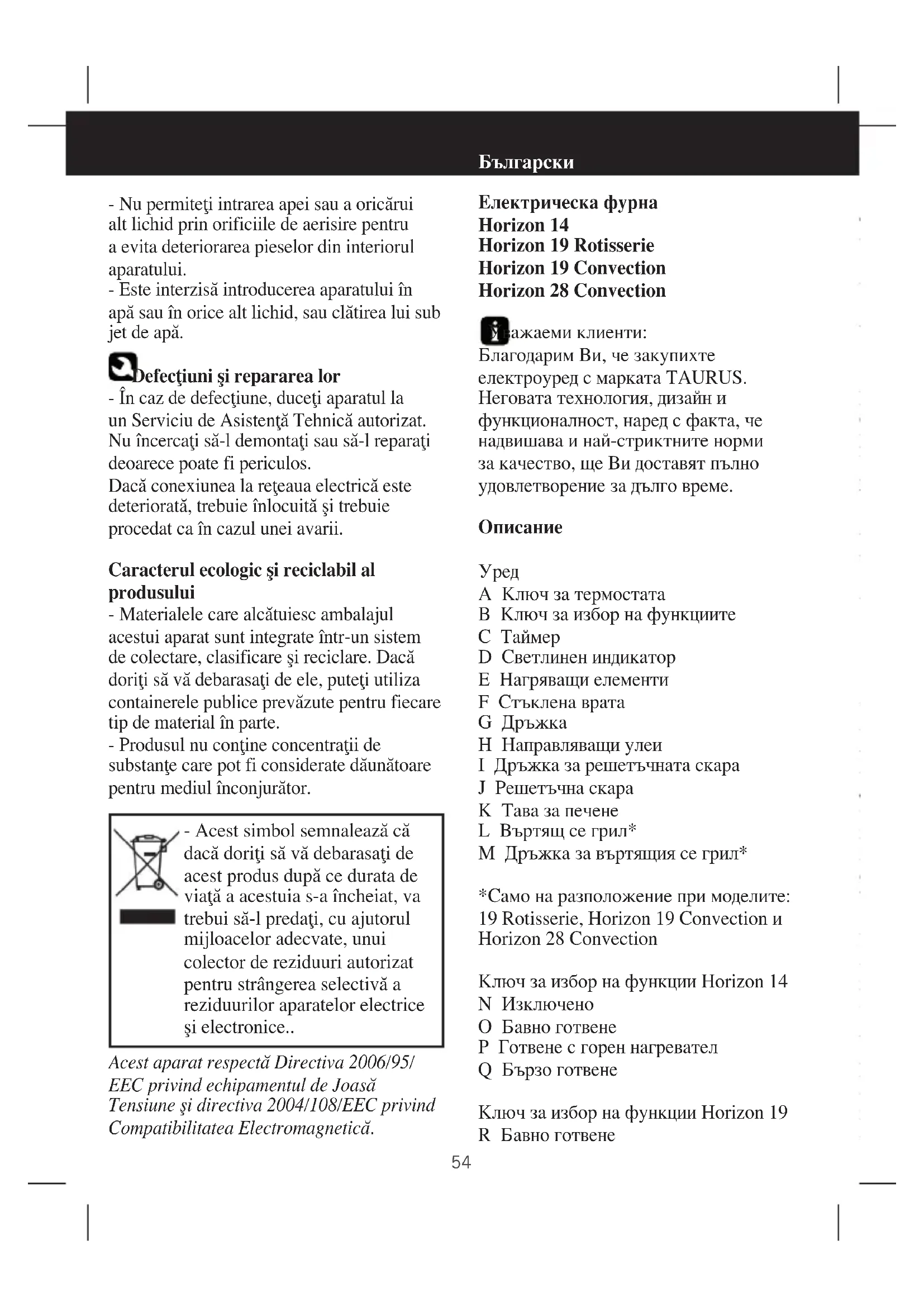 AA Бързо готвене без конвекция AB Готвене с горен нагревател в режим грил (Rotisserie) AC Бързо готвене в режим конвекция и грил (Rotisserie) Съветиипредупрежденияза безопасност - Прочетете внимателно тази брошура преди да пуснете уреда в действие и я запазете за по-нататъшни справки. Неспазването на инструкциите може да доведе до злополука. - Преди да използвате ел. уреда за първи път, почистете всички части, които са в контакт с хранителните продукти, следвайки упътванията от раздел “Почистване”. Мястозаползванеилиработа: - Уредът трябва да се постави и използва върху равна и стабилна повърхност. - ПРЕДУПРЕЖДЕНИЕ: Не покривайте уреда, за да не се пренагрее. Електрическабезопасност: - Не използвайте уреда при повреден кабел или щепсел. - Преди да свържете уреда към мрежата, 54 55Електрическафурна Horizon 14 Horizon 19 Rotisserie Horizon 19 Convection Horizon 28 Convection Уважаеми клиенти: Благодарим Ви, че закупихте електроуред с марката TAURUS. Неговата технология, дизайн и функционалност, наред с факта, че надвишава и най-стриктните норми за качество, ще Ви доставят пълно удовлетворение за дълго време.