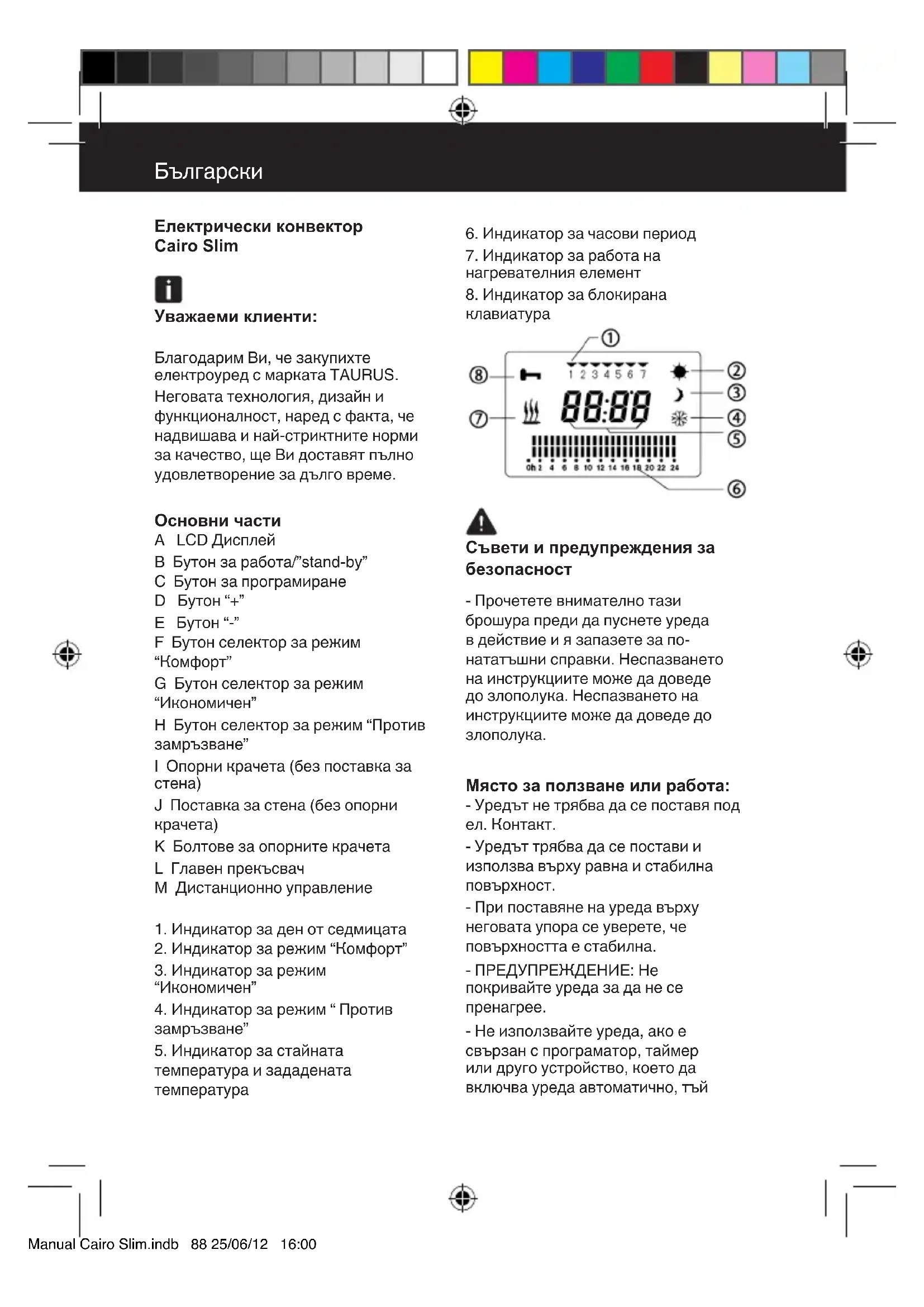 - Включете уреда, от прекъсвач за включване/изключване. - Уредът се задества, като премине на опция stand-by. Станата температура ще се появи на екрана. За да заработи уреда, натиснете бутона за работа/”stand-by”. То ще заработи на режима, на кото е бил включен последния път. Ако това е първата му употреба, на екрана ще се появи следната фабрична настрока: Избор на режим на работа Конвекторът предлага 2 възможни режима на работа: ръчен или автоматичен Ръчен режим на работа Уредът предоставя възможност за ръчен режим на работа без нужда от програмиране. - С помоща на бутона селектор за режим “Комфорт”, “Икономичен” или “Против замръзване” изберете желаният режим. - Натиснете “+” или “- “, за да изберете зададената температура. Докато избирате зададената температура, буквата“C” ще се появи примигваки. - След избирането на зададената температура, тя ще се появи на екрана и станата температура ще се появи отново. - Символът ще изчезне от екрана, когато достигне до зададената температура. - Когато температурата падне 3 градуса, символът ще се появи отново и уреда отново ще започне да работи автоматично. Автоматичен режим на работа - За да използвате уреда на режима Автоматично натиснете бутона за програмиране. Ако това е първата му употреба, на екрана ще се появи следната фабрична настрока: Задаване на желаната температура Уредът предоставя възможноста да бъде програмиран в зависимост от деня и часа и различните режими на работа: “Комфорт”, “Икономичен” и Manual Cairo Slim.indb 91 25/06/12 16:00“Против замръзване”. - Преди да програмирате уреда, трябва да установите зададената температура за различните режими на употреба: “Комфорт”, “Икономичен” и “Против замръзване”. - Натиснете бутона за избиране на режим “Комфорт”, “Икономичен” или “Против замръзване”, за да изберете желания режим. - Натиснете “+” или “- “за да изберете зададената температура. Докато избирате зададената температура, буквата“C” ще се появи примигваки. - След избирането на зададената температура, тя ще се появи на екрана и станата температура ще се появи отново. - Диапазона на температурите за режим “Комфорт” е от 5º до 35º. Диапазона на температурите за “Икономичен” режим е от 5º до 25º. - Диапазона на температурите за режима “Против замръзване”. е от 5º до 15º. Програмиране Денят (24 часа) е разделен на еднакви части, които са изобразени на екрана като малки часови периоди. Като изберете режим на работа за всеки час, ще сте програмирали целия ден. За всеки час е определена желаната температура: две черти означават режим “Комфорт”, една черта - “Икономичен” режим, а часовете, които не са обозначени с черта (празните часове), поддържат температура достатъчна за режим “Против замръзване”. Режим “Комфорт” Режим “Икономичен” Режим “Против замръзване” - За да установите седмичното програмиране, натиснете бутона програмиране в продължение на няколко секунди. - На екрана ще се появят цифрите за час. Използвате бутоните “+” и “ – “ за да се придвижите напред или назад, докато часовника достигне до текущия час и потвърдете като натиснете бутона програмиране. Повторете същите стъпки, за да настроите минутите. - На екрана ще се появи денят 1 (понеделник) използвате бутоните “+” и “ - “ за да достигнете до денят от седмицата, кото желаете да програмирате и потвърдете като натиснете бутона п