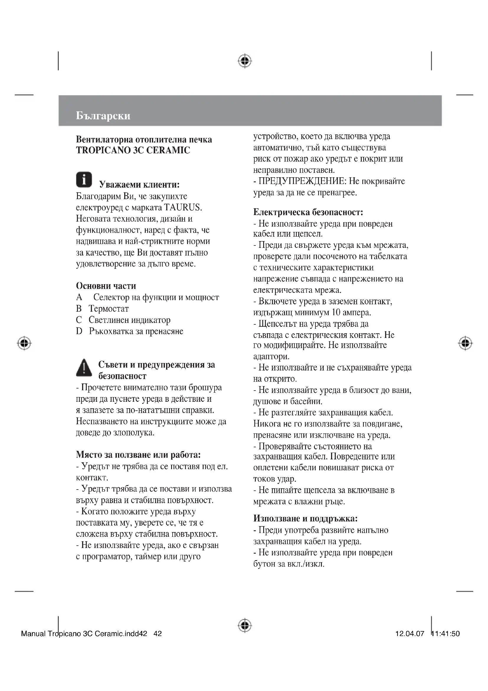 Неизправности и ремонт - В случай на неизправност, занесете уреда в оторизиран сервиз за техническо обслужване. Не се опитвайте да го разглобите или ремонтирате, тъй като това може да се окаже опасно. - Ако захранващият кабел е повреден, трябва да се подмени. Направете същото както при установяването на неизправност. Опазване на околната среда и рециклиране на продукта - Материалите, от които се състои опаковката на този електроуред, са включени в система за тяхното събиране, класифициране и рециклиране. Ако желаете да се освободите от тях, можете да използвате обществените контейнери, предназначени за разделно събиране на отпадъците. - В продукта няма концентрации на вещества, които могат да се смятат вредни за околната среда. - Ако желаете да се освободите от продукта, след като експлоатационният му живот изтече, трябва да го предадете по подходящ начин на фирма за преработка на отпадъци, оторизирана за разделно събиране на отпадъци от електрическа и електронна апаратура. Този уред отговаря на изискванията на Директива 2006/95/ EC за ниско напрежение и Директива 2004/108/ЕС за електромагнитна съвместимост. Manual Tropicano 3C Ceramic.indd44 44Manual Tropicano 3C Ceramic.indd44 44 12.04.07 11:41:5112.04.07 11:41:51Manual Tropicano 3C Ceramic.indd45 45Manual Tropicano 3C Ceramic.indd45 45 12.04.07 11:41:5212.04.07 11:41:52Manual Tropicano 3C Ceramic.indd46 46Manual Tropicano 3C Ceramic.indd46 46 12.04.07 11:41:5212.04.07 11:41:52Manual Tropicano 3C Ceramic.indd47 47Manual Tropicano 3C Ceramic.indd47 47 12.04.07 11:41:5312.04.07 11:41:53Manual Tropicano 3C Ceramic.indd48 48Manual Tropicano 3C Ceramic.indd48 48 12.04.07 11:41:5412.04.07 11:41:54Manual Tropicano 3C Ceramic.indd49 49Manual Tropicano 3C Ceramic.indd49 49 12.04.07 11:41:5412.04.07 11:41:54Manual Tropicano 3C Ceramic.indd50 50Manual Tropicano 3C Ceramic.indd50 50 12.04.07 11:41:5412.04.07 11:41:54Manual Tropicano 3C Ceramic.indd51 51Manual Tropicano 3C Ceramic.indd51 51 12.04.07 11:41:5512.04.07 11:41:55Avda. Barcelona, s/n E 25790 Oliana Spain www.taurus.es Product weight (aproximate) Tropicano 3C Ceramic: G.W. 1,84 Kg N.W. 1,55 Kg Manual Tropicano 3C Ceramic.indd52 52Manual Tropicano 3C Ceramic.indd52 52 12.04.07 11:41:5512.04.07 11:41:55