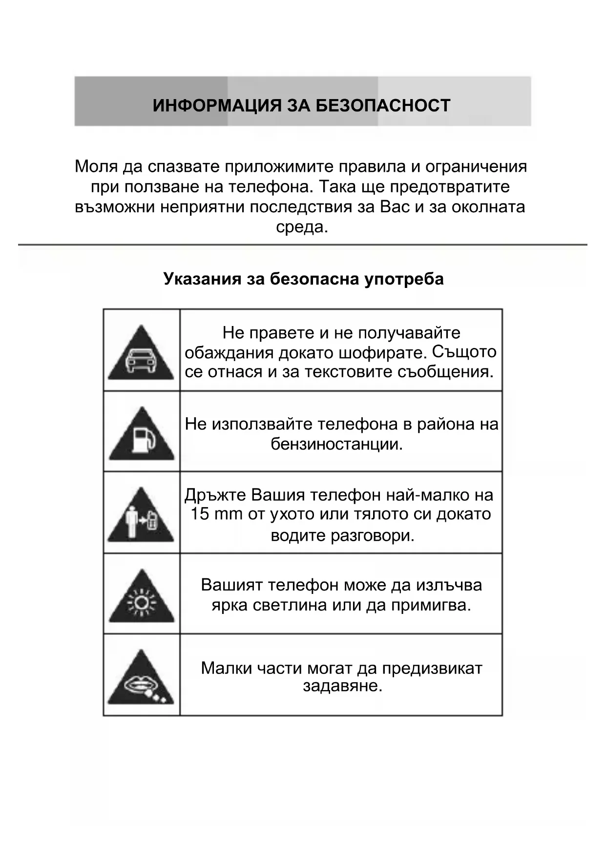 Изключвайте телефона на самолети и летища.Не разглобявайте телефона си. Изключвайте телефона в близост до запалими материали или течности.