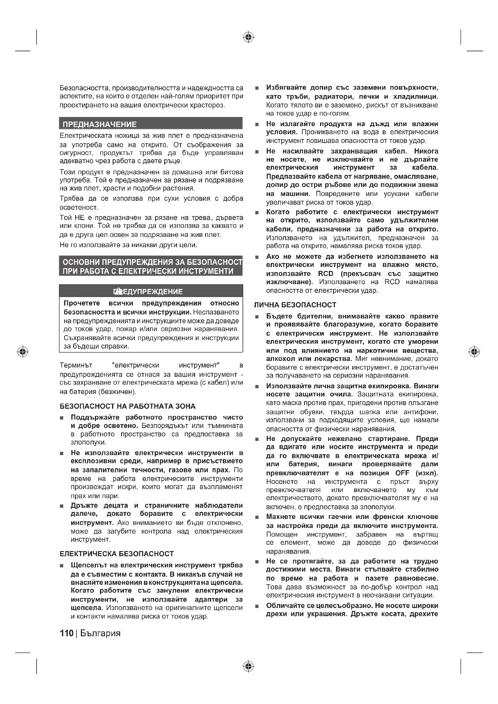 Pripojte do elektrickej zásuvky Odpojte z elektrickej zásuvky Diely alebo príslušenstvo predávané samostatne Poznámka Varovanie Nasledujúce značky a významy vysvetľujú úroveň rizika spojeným s výrobkom. NEBEZPEČENSTVO Označuje bezprostredne nebezpečnú situáciu, ktorá môže vyústiť v smrť, alebo vážne zranenie. VAROVANIE Označuje potenciálne nebezpečnú situáciu, ktorá môže vyústiť v smrť, alebo vážne zranenie. VÝSTRAHA Označuje potenciálne nebezpečnú situáciu, ktorá môže vyústiť v ľahké, alebo stredne ťažké zranenie. VÝSTRAHA Bez symbolu bezpečnostného alarmu Označuje situáciu, ktorá môže zapríčiniť poškodenie majetku.110 | България Безопасността, производителността и надеждността са аспектите, на които е отделен най-голям приоритет при проектирането на вашия електрически храсторез. ПРЕДНАЗНАЧЕНИЕ Електрическата ножица за жив плет е предназначена за употреба само на открито. От съображения за сигурност, продуктът трябва да бъде управляван адекватно чрез работа с двете ръце. Този продукт е предназначен за домашна или битова употреба. Той е предназначен за рязане и подрязване на жив плет, храсти и подобни растения. Трябва да се използва при сухи условия с добра осветеност. Той НЕ е предназначен за рязане на трева, дървета или клони. Той не трябва да се използва за каквато и да е друга цел освен за подрязване на жив плет. Не го използвайте за никакви други цели. ОСНОВНИ ПРЕДУПРЕЖДЕНИЯ ЗА БЕЗОПАСНОСТ ПРИ РАБОТА С ЕЛЕКТРИЧЕСКИ ИНСТРУМЕНТИ ПРЕДУПРЕЖДЕНИЕ Прочетете всички предупреждения относно безопасността и всички инструкции. Неспазването на предупрежденията и инструкциите може да доведе до токов удар, пожар и/или сериозни наранявания. Съхранявайте всички предупреждения и инструкции за бъдещи справки. Терминът "електрически инструмент" в предупрежденията се отнася за вашия инструмент - със захранване от електрическата мрежа (с кабел) или на батерия (безжичен). БЕЗОПАСНОСТ НА РАБОТНАТА ЗОНА ■ Поддържайте работното пространство чисто и добре осветено. Безпорядъкът или тъмнината в работното пространство са предпоставка за