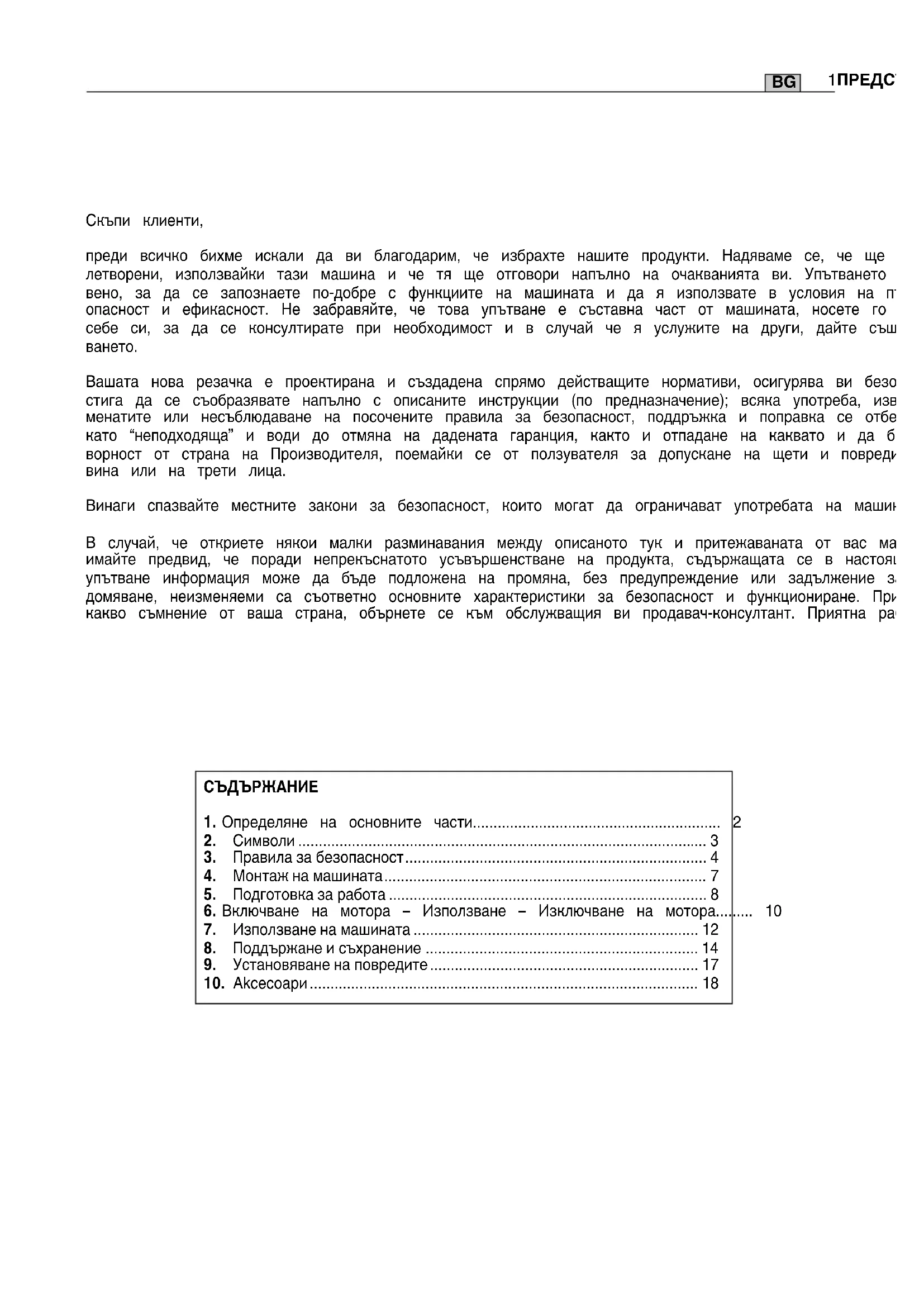 Вашата нова резачка е проектирана и създадена спрямо действащите нормативи, осигурява ви безопасност, стига да се съобразявате напълно с описаните инструкции (по предназначение); всяка употреба, извън спо- менатите или несъблюдаване на посочените правила за безопасност, поддръжка и поправка се отбелязва като “неподходяща” и води до отмяна на дадената гаранция, както и отпадане на каквато и да било отго- ворност от страна на Производителя, поемайки се от ползувателя за допускане на щети и повреди по негова вина или на трети лица. Винаги спазвайте местните закони за безопасност, които могат да ограничават употребата на машината. В случай, че откриете някои малки разминавания между описаното тук и притежаваната от вас машина, имайте предвид, че поради непрекъснатото усъвършенстване на продукта, съдържащата се в настоящото упътване информация може да бъде подложена на промяна, без предупреждение или задължение за осве- домяване, неизменяеми са съответно основните характеристики за безопасност и функциониране. При ня- какво съмнение от ваша страна, обърнете се към обслужващия ви продавач-консултант. Приятна работа!