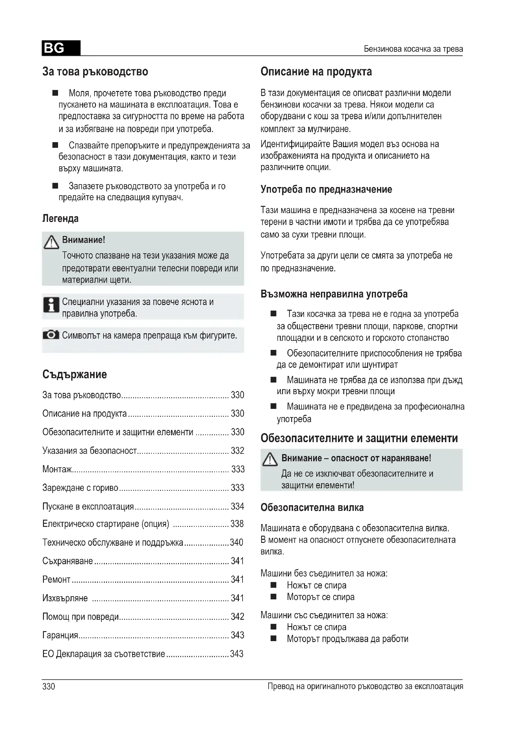 Точнотоспазваненатезиуказанияможеда предотвратиевентуалнителесниповредиили материалнищети. Специалниуказаниязаповечеяснотаи правилнаупотреба. Символътнакамерапрепращакъмфигурите. Описание на продукта Втазидокументациясеописватразличнимодели бензиновикосачкизатрева.Някоимоделиса оборудванискошзатреваи/илидопълнителен комплектзамулчиране. ИдентифицирайтеВашиямоделвъзоснована изображениятанапродуктаиописаниетона различнитеопции. Употреба по предназначение Тазимашинаепредназначеназакосененатревни теренивчастниимотиитрябвадасеупотребява самозасухитревниплощи. Употребатазадругицелисесмятазаупотребане попредназначение. Възможна неправилна употреба Тазикосачказатреванеегодназаупотреба заобщественитревниплощи,паркове,спортни площадкиивселскотоигорскотостопанство Обезопасителнитеприспособлениянетрябва даседемонтиратилишунтират Машинатанетрябвадасеизползвапридъжд иливърхумокритревниплощи Машинатанеепредвиденазапрофесионална