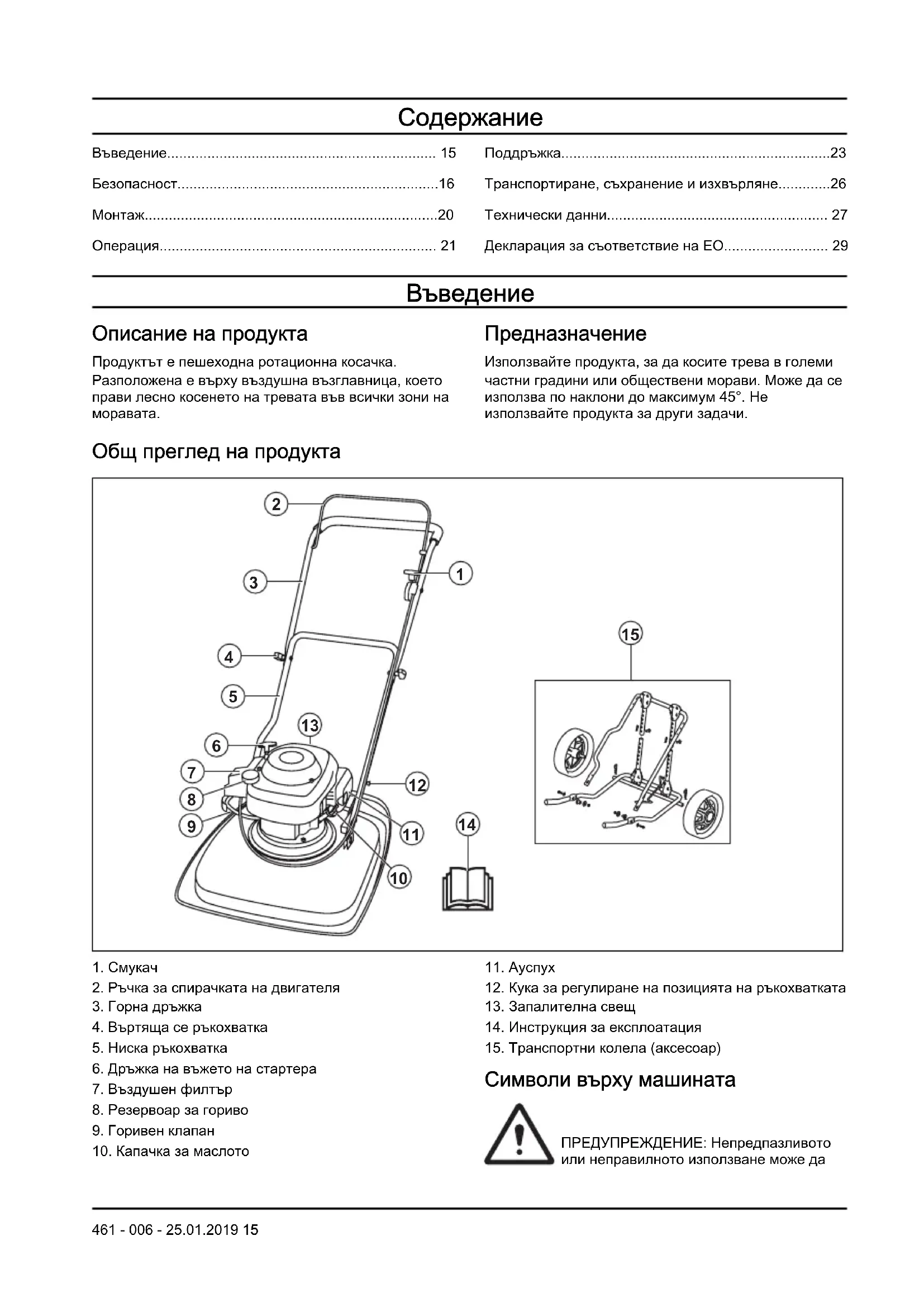 Ауспухът се нагрява много по време и след работа и също при обороти на празен ход. Бъдете внимателни близо до запалими 18 461 - 006 - 25.01.2019материали и/или газове, за да предотвратите възникването на пожар. Безопасност при работа с гориво ПРЕДУПРЕЖДЕНИЕ: Прочетете следващите предупредителни указания, преди да използвате машината.