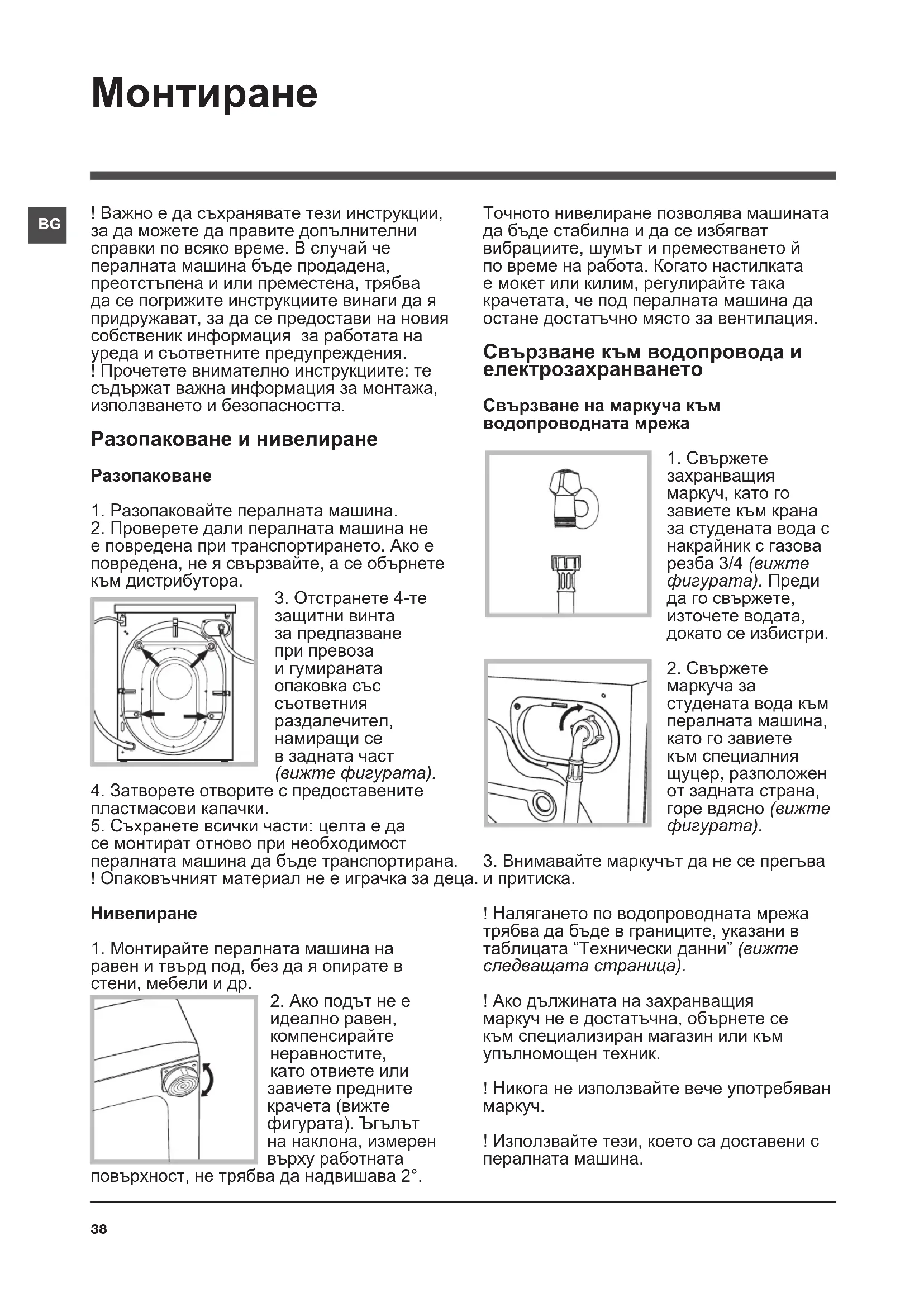 ! Използвайте тези, което са доставени с пералната машина. ! Важно е да съхранявате тези инструкции, за да можете да правите допълнителни справки по всяко време. В случай че пералната машина бъде продадена, преотстъпена и или преместена, трябва да се погрижите инструкциите винаги да я придружават, за да се предостави на новия собственик информация за работата на уреда и съответните предупреждения. ! Прочетете внимателно инструкциите: те съдържат важна информация за монтажа, използването и безопасността. Разопаковане и нивелиране Разопаковане