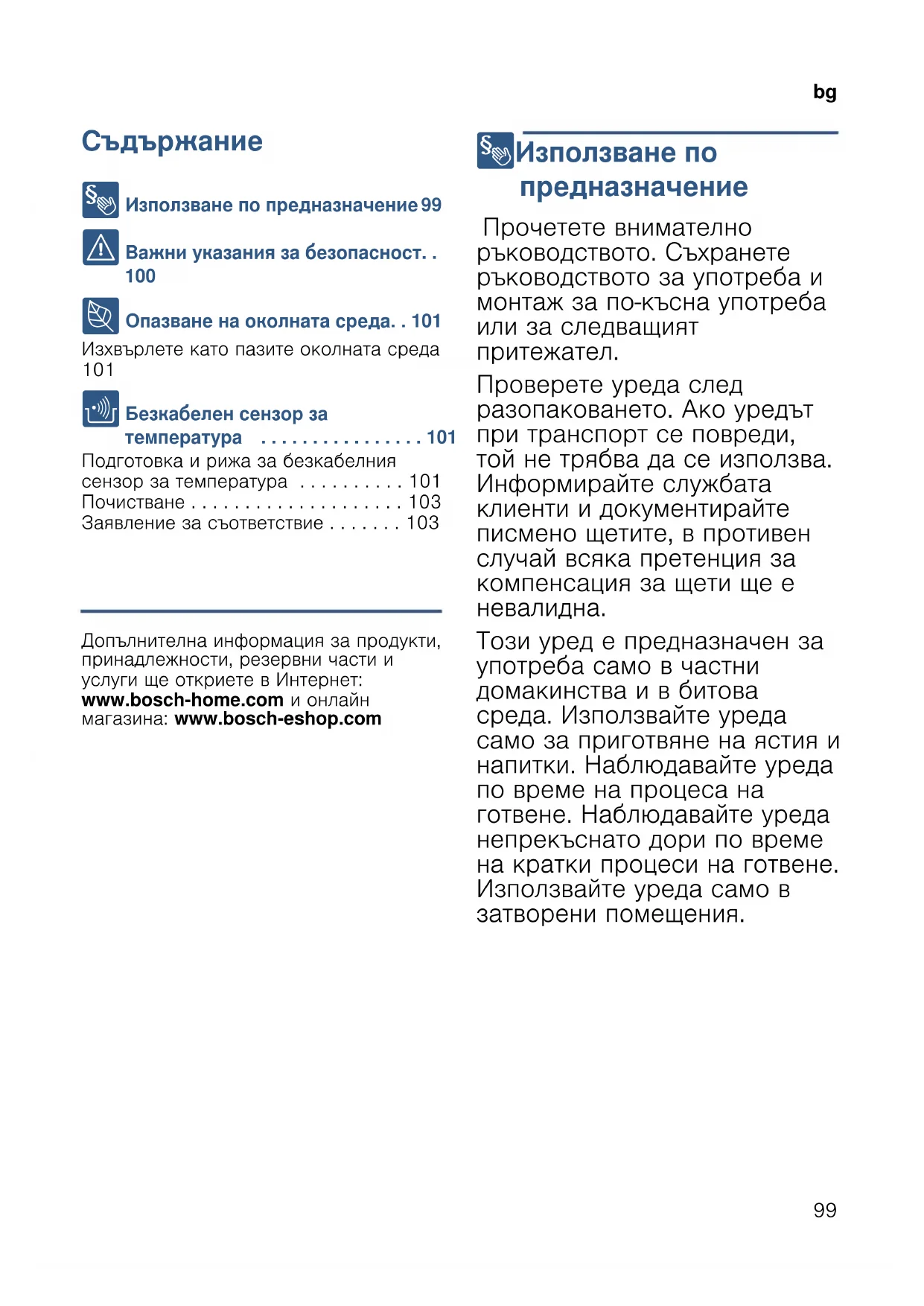 - Заявление за съответствие Информация за продукта Допълнителна информация за продукти, принадлежности, резервни части и услуги ще откриете в Интернет: www.bosch-home.com и онлайн магазина: www.bosch-eshop.com 8 Използване по предназначение Из п о лз в а н е по предназнач ение Прочетете внимателно ръководството. Съхранете ръководството за употреба и монтаж за по-късна употреба или за следващият притежател. Проверете уреда след разопаковането. Ако уредът при транспорт се повреди, той не трябва да се използва. Информирайте службата клиенти и документирайте писмено щетите, в противен случай всяка претенция за компенсация за щети ще е p. 103