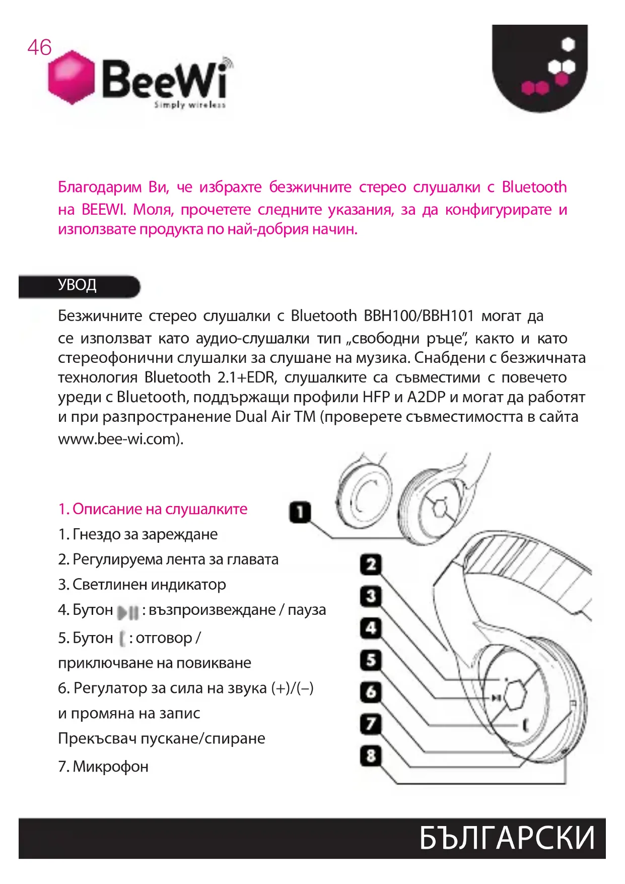 Благодарим Ви, че избрахте безжичните стерео слушалки с Bluetooth на BEEWI. Моля, прочетете следните указания, за да конфигурирате и използвате продукта по най-добрия начин.