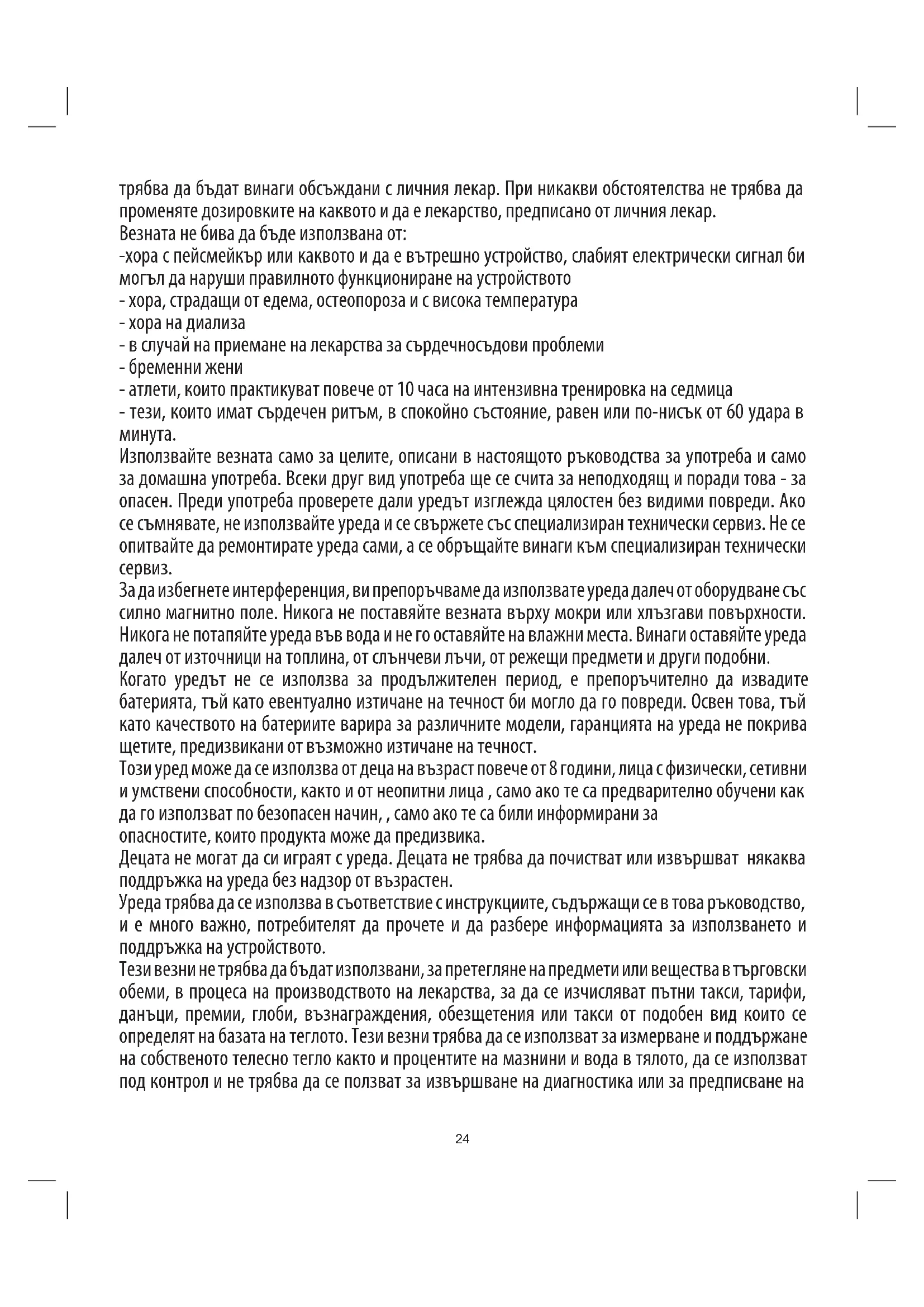 ВЕЗНА ЗА КОНТРОЛ НА ТЯЛОТО ВАЖНИ ПРАВИЛА ЗА СИГУРНОСТ И ПРЕДУПРЕЖДЕНИЯ Стойностите, които се измерват от този апарат за следене на телесните мазнини, са приблизителни и не бива по никаква причина да заместват мнението на лекаря. Не забравяйте: саморъчно измерване означава контрол, а не диагноза или лечение. Необичайни стойности24