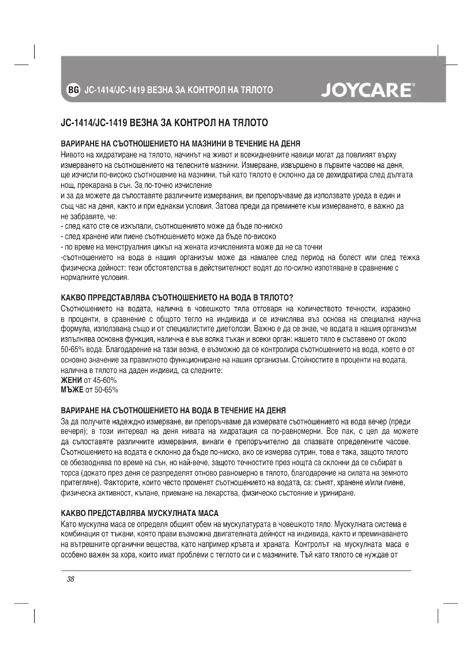 JC-1414/JC-1419 ВЕЗНА ЗА КОНТРОЛ НА ТЯЛОТО ВАРИРАНЕ НА СЪОТНОШЕНИЕТО НА МАЗНИНИ В ТЕЧЕНИЕ НА ДЕНЯ Нивото на хидратиране на тялото, начинът на живот и всекидневните навици могат да повлияят върху измерването на съотношението на телесните мазнини. Измерване, извършено в първите часове на деня, ще изчисли по-високо съотношение на мазнини, тъй като тялото е склонно да се дехидратира след дългата нощ, прекарана в сън. За по-точно изчисление и за да можете да съпоставяте различните измервания, ви препоръчваме да използвате уреда в един и същ час на деня, както и при еднакви условия. Затова преди да преминете към измерването, е важно да не забравяте, че: - след като сте се изкъпали, съотношението може да бъде по-ниско - след хранене или пиене съотношението може да бъде по-високо - по време на менструалния цикъл на жената изчисленията може да не са точни -съотношението на вода в нашия организъм може да намалее след период на болест или след тежка физическа дейност: тези обстоятелства в действителност водят до по-силно изпотяване в сравнение с нормалните условия. КАКВО ПРРЕДСТАВЛЯВА СЪОТНОШЕНИЕТО НА ВОДА В ТЯЛОТО? Съотношението на водата, налична в човешкото тяла отговаря на количеството течности, изразено в проценти, в сравнение с общото тегло на индивида и се изчислява въз основа на специална научна формула, използвана също и от специалистите диетолози. Важно е да се знае, че водата в нашия организъм изпълнява основна функция, налична е във всяка тъкан и всеки орган: нашето тяло е съставено от около 50-65% вода. Благодарение на тази везна, е възможно да се контролира съотношението на вода, което е от основно значение за правилното функциониране на нашия организъм. Стойностите в проценти на водата, налична в тялото на даден индивид, са следните: ЖЕНИ от 45-60% МЪЖЕ от 50-65% ВАРИРАНЕ НА СЪОТНОШЕНИЕТО НА ВОДА В ТЕЧЕНИЕ НА ДЕНЯ За да получите надеждно измерване, ви препоръчваме да измервате съотношението на вода вечер (преди вечеря); в този интервал на деня нивата на хидратация са по-равномерни. Все пак, с цел да можете да съпоставяте различните измервания, винаги е препоръчително да спазвате определените часове. Съотношението на водата е склонно да бъде по-ниско, ако се измерва сутрин, това е така, защото тялото се обезводнява по време на сън, но най-вече, защото течностите през нощта са склонни да се събират в торса (докато през деня се разпределят отново равномерно в тялото, благодарение на силата на земното притегляне). Факторите, които често променят съотношението на водата, са: сънят, хранене и/или пиене, физическа активност, къпане, приемане на лекарства, физическо състояние и уриниране. КАКВО ПРЕДСТАВЛЯВА МУСКУЛНАТА МАСА Като мускулна маса се определя общият обем на мускулатурата в човешкото тяло. Мускулната система е комбинация от тъкани, която прави възможна двигателната дейност на индивида, както и преминаването на вътрешните органични вещества, като например кръвта и храната. Контролът на мускулната маса е особено важен за хора, които имат проблеми с теглото си и с мазнините. Тъй като тялото се нуждае от39 JC-1414/JC-1419 ВЕЗНА ЗА КОНТРОЛ НА ТЯЛОТО