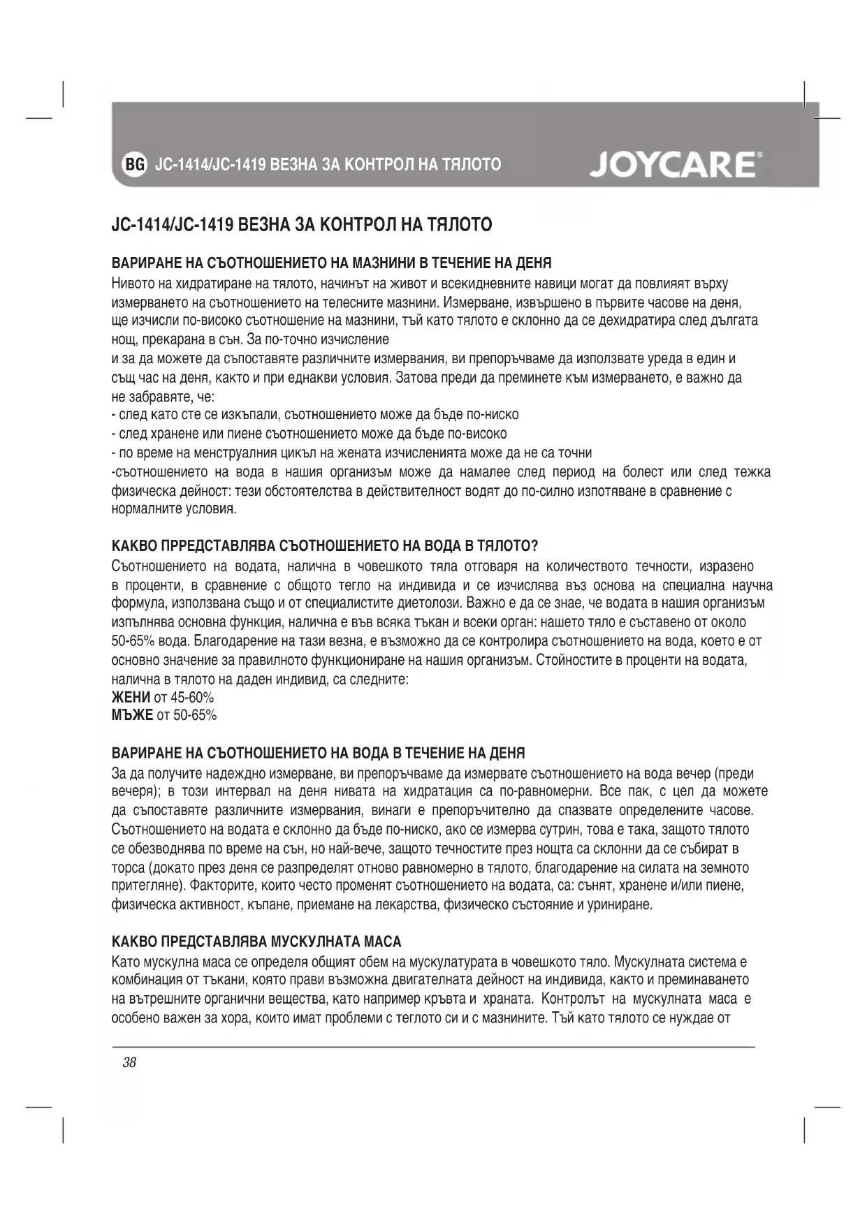 JC-1414/JC-1419 ВЕЗНА ЗА КОНТРОЛ НА ТЯЛОТО ВАРИРАНЕ НА СЪОТНОШЕНИЕТО НА МАЗНИНИ В ТЕЧЕНИЕ НА ДЕНЯ Нивото на хидратиране на тялото, начинът на живот и всекидневните навици могат да повлияят върху измерването на съотношението на телесните мазнини. Измерване, извършено в първите часове на деня, ще изчисли по-високо съотношение на мазнини, тъй като тялото е склонно да се дехидратира след дългата нощ, прекарана в сън. За по-точно изчисление и за да можете да съпоставяте различните измервания, ви препоръчваме да използвате уреда в един и същ час на деня, както и при еднакви условия. Затова преди да преминете към измерването, е важно да не забравяте, че: - след като сте се изкъпали, съотношението може да бъде по-ниско - след хранене или пиене съотношението може да бъде по-високо - по време на менструалния цикъл на жената изчисленията може да не са точни -съотношението на вода в нашия организъм може да намалее след период на болест или след тежка физическа дейност: тези обстоятелства в действителност водят до по-силно изпотяване в сравнение с нормалните условия. КАКВО ПРРЕДСТАВЛЯВА СЪОТНОШЕНИЕТО НА ВОДА В ТЯЛОТО? Съотношението на водата, налична в човешкото тяла отговаря на количеството течности, изразено в проценти, в сравнение с общото тегло на индивида и се изчислява въз основа на специална научна формула, използвана също и от специалистите диетолози. Важно е да се знае, че водата в нашия организъм изпълнява основна функция, налична е във всяка тъкан и всеки орган: нашето тяло е съставено от около 50-65% вода. Благодарение на тази везна, е възможно да се контролира съотношението на вода, което е от основно значение за правилното функциониране на нашия организъм. Стойностите в проценти на водата, налична в тялото на даден индивид, са следните: ЖЕНИ от 45-60% МЪЖЕ от 50-65% ВАРИРАНЕ НА СЪОТНОШЕНИЕТО НА ВОДА В ТЕЧЕНИЕ НА ДЕНЯ За да получите надеждно измерване, ви препоръчваме да измервате съотношението на вода вечер (преди вечеря); в този интервал на деня нивата на хидратация са по-равномерни. Все пак, с цел да можете да съпоставяте различните измервания, винаги е препоръчително да спазвате определените часове. Съотношението на водата е склонно да бъде по-ниско, ако се измерва сутрин, това е така, защото тялото се обезводнява по време на сън, но най-вече, защото течностите през нощта са склонни да се събират в торса (докато през деня се разпределят отново равномерно в тялото, благодарение на силата на земното притегляне). Факторите, които често променят съотношението на водата, са: сънят, хранене и/или пиене, физическа активност, къпане, приемане на лекарства, физическо състояние и уриниране. КАКВО ПРЕДСТАВЛЯВА МУСКУЛНАТА МАСА Като мускулна маса се определя общият обем на мускулатурата в човешкото тяло. Мускулната система е комбинация от тъкани, която прави възможна двигателната дейност на индивида, както и преминаването на вътрешните органични вещества, като например кръвта и храната. Контролът на мускулната маса е особено важен за хора, които имат проблеми с теглото си и с мазнините. Тъй като тялото се нуждае от39 JC-1414/JC-1419 ВЕЗНА ЗА КОНТРОЛ НА ТЯЛОТО