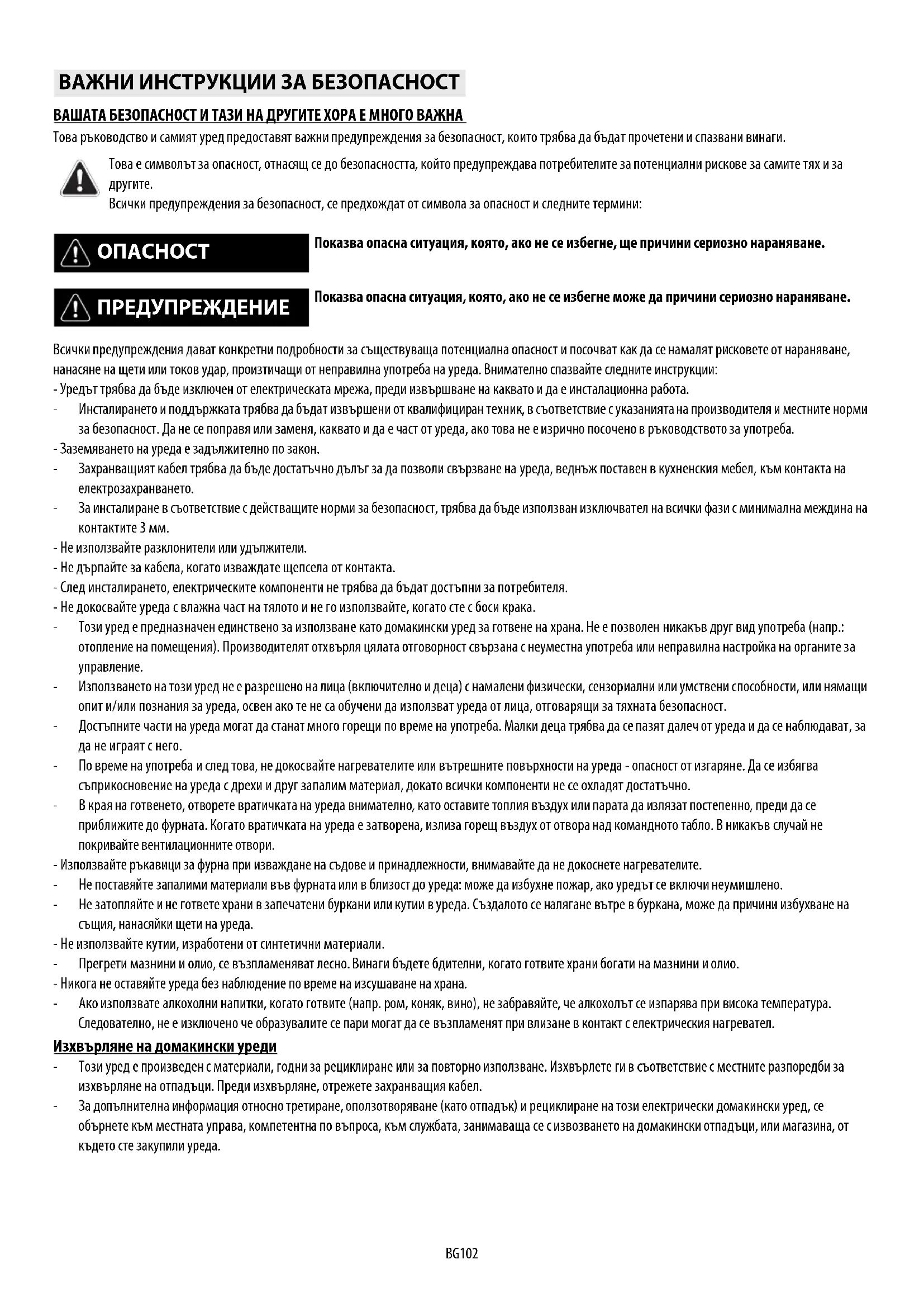 ВАШАТА БЕЗОПАСНОСТ И ТАЗИ НА ДРУГИТЕ ХОРА Е МНОГО ВАЖНА Това ръководство и самият уред предоставят важни предупреждения за безопасност, които трябва да бъдат прочетени и спазвани винаги. Всички предупреждения дават конкретни подробности за съществуваща потенциална опасност и посочват как да се намалят рисковете от нараняване, нанасяне на щети или токов удар, произтичащи от неправилна употреба на уреда. Внимателно спазвайте следните инструкции: - Уредът трябва да бъде изключен от електрическата мрежа, преди извършване на каквато и да е инсталационна работа. - Инсталирането и поддържката трябва да бъдат извършени от квалифициран техник, в съответствие с указанията на производителя и местните норми за безопасност. Дане се поправя или заменя, каквато и да е част от уреда, ако това не е изрично посочено в ръководството за употреба. - Заземяването на уреда е задължително по закон. - Захранващият кабел трябва да бъде достатъчно дълъг за да позволи свързване на уреда, веднъж поставен в кухненския мебел, към контакта на електрозахранването. - За инсталиране в съответствие с действащите норми за безопасност, трябва да бъде използван изключвател на всички фази с минимална междина на контактите 3 мм. - Не използвайте разклонители или удължители. - Не дърпайте за кабела, когато изваждате щепсела от контакта. - След инсталирането, електрическите компоненти не трябва да бъдат достъпни за потребителя. - Не докосвайте уреда с влажна част на тялото и не го използвайте, когато сте с боси крака. - Този уред е предназначен единствено за използване като домакински уред за готвене на храна. Не е позволен никакъв друг вид употреба (напр.: отопление на помещения). Производителят отхвърля цялата отговорност свързана с неуместна употреба или неправилна настройка на органите за управление. - Използването на този уред не е разрешено на лица (включително и деца) с намалени физически, сензориални или умствени способности, или нямащи опит и/или познания за уреда, освен ако те не са обучени да използват уреда от лица, отговарящи за тяхната безопасност. - Достъпните части на уреда могат да станат много горещи по време на употреба. Малки деца трябва да се пазят далеч от уреда и да се наблюдават, за да не играят с него. - По време на употреба и след това, не докосвайте нагревателите или вътрешните повърхности на уреда - опасност от изгаряне. Да се избягва съприкосновение на уреда с дрехи и друг запалим материал, докато всички компоненти не се охладят достатъчно. - В края на готвенето, отворете вратичката на уреда внимателно, като оставите топлия въздух или парата да излязат постепенно, преди да се приближите до фурната. Когато вратичката на уреда е затворена, излиза горещ въздух от отвора над командното табло. В никакъв случай не покривайте вентилационните отвори. - Използвайте ръкавици за фурна при изваждане на съдове и принадлежности, внимавайте да не докоснете нагревателите. - Не поставяйте запалими материали във фурната или в близост до уреда: може да избухне пожар, ако уредът се включи неумишлено. - Не затопляйте и не гответе храни в запечатени буркани или кутии в уреда. Създалото се налягане вътре в буркана, може да причини избухване на същия, нанасяйки щети на уреда. - Не използвайте кутии, изработени от синтетични материали. - Прегрети мазнини и олио, се възпламеняв