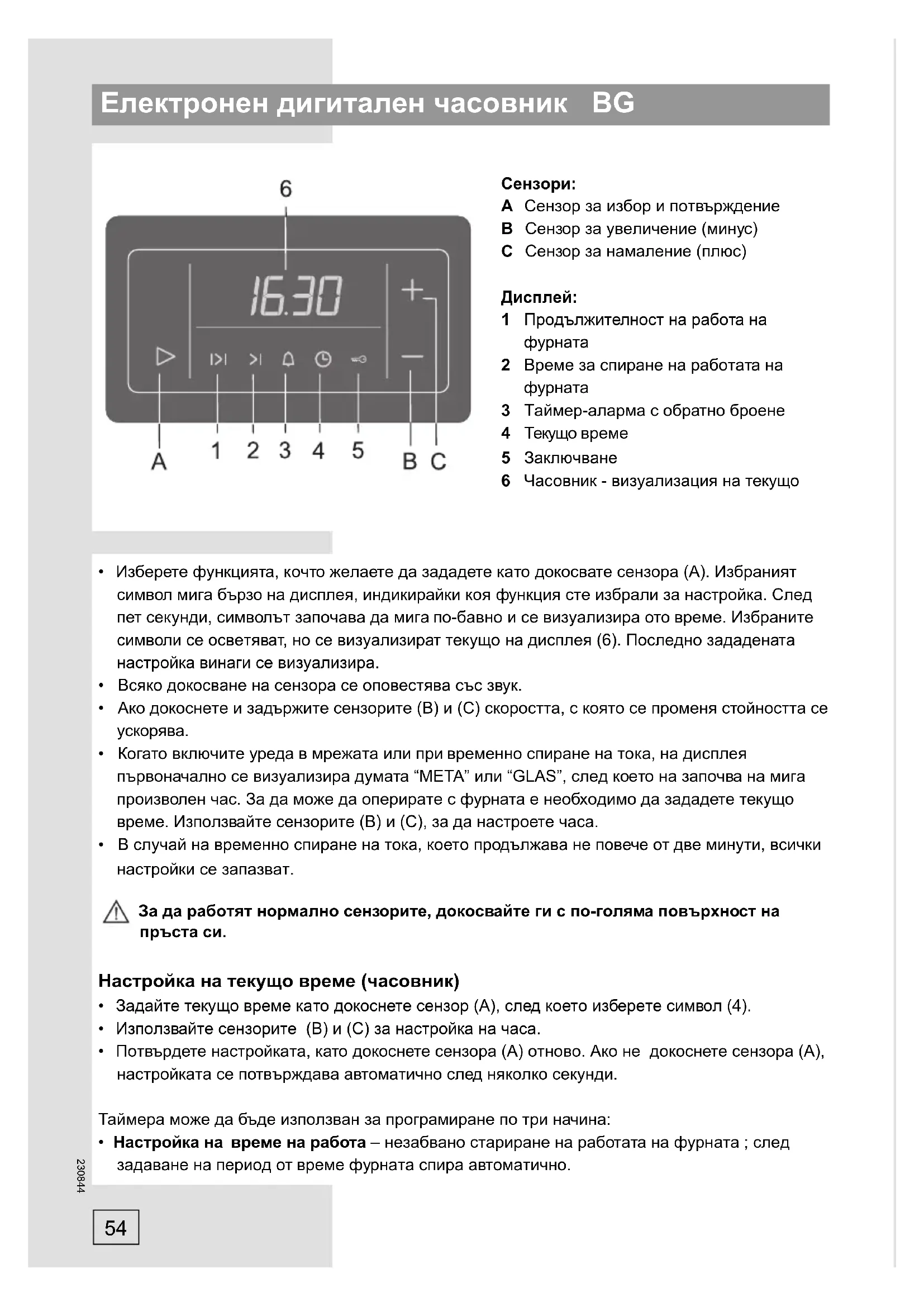 - Когато включите уреда в мрежата или при временно спиране на тока, на дисплея първоначално се визуализира думата “META” или “GLAS”, след което на започва на мига произволен час. За да може да оперирате с фурната е необходимо да зададете текущо време. Използвайте сензорите (В) и (С), за да настроете часа.