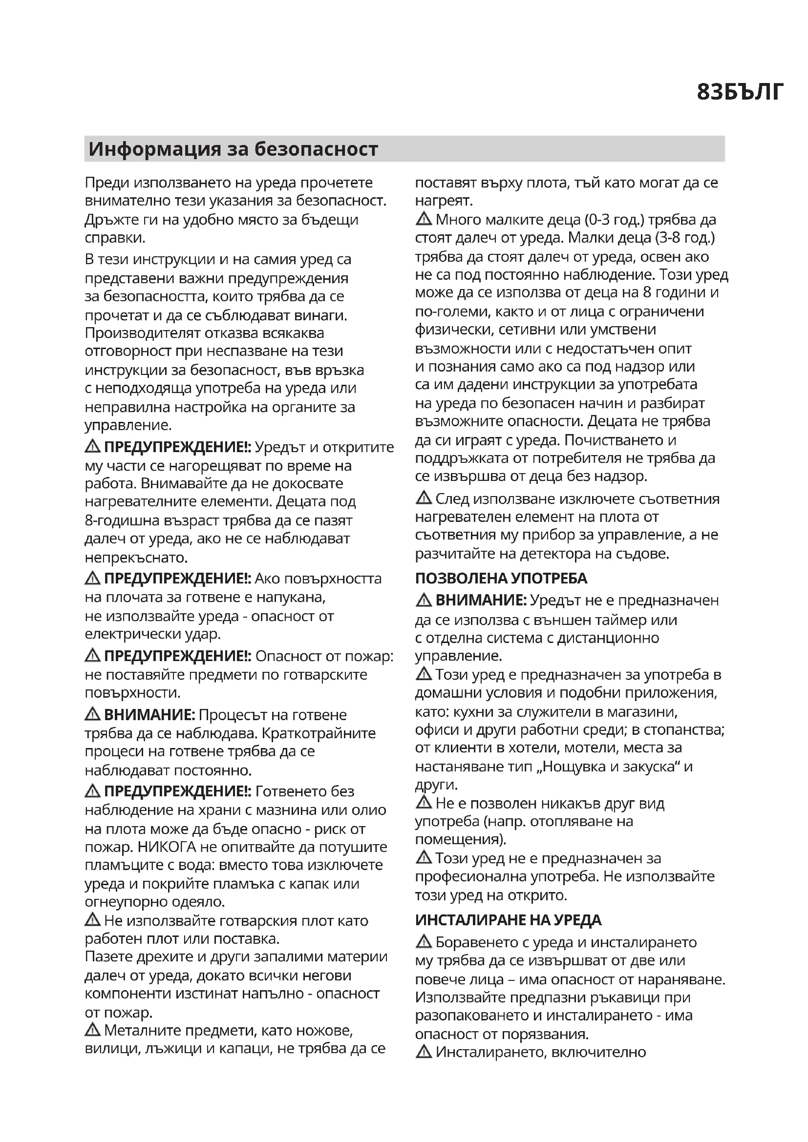 В тези инструкции и на самия уред са представени важни предупреждения за безопасността, които трябва да се прочетат и да се съблюдават винаги. Производителят отказва всякаква отговорност при неспазване на тези инструкции за безопасност, във връзка с неподходяща употреба на уреда или неправилна настройка на органите за управление. ПРЕДУПРЕЖДЕНИЕ!:Уредът и откритите му части се нагорещяват по време на работа. Внимавайте да не докосвате нагревателните елементи. Децата под 8-годишна възраст трябва да се пазят далеч от уреда, ако не се наблюдават непрекъснато. ПРЕДУПРЕЖДЕНИЕ!:Ако повърхността на плочата за готвене е напукана, не използвайте уреда - опасност от електрически удар. ПРЕДУПРЕЖДЕНИЕ!: Опасност от пожар: не поставяйте предмети по готварските повърхности. ВНИМАНИЕ:Процесът на готвене трябва да се наблюдава. Краткотрайните процеси на готвене трябва да се наблюдават постоянно. ПРЕДУПРЕЖДЕНИЕ!: Готвенето без наблюдение на храни с мазнина или олио на плота може да бъде опасно - риск от пожар. НИКОГА не опитвайте да потушите пламъците с вода: вместо това изключете уреда и покрийте пламъка с капак или огнеупорно одеяло. Не използвайте готварския плот като работен плот или поставка. Пазете дрехите и други запалими материи далеч от уреда, докато всички негови компоненти изстинат напълно - опасност