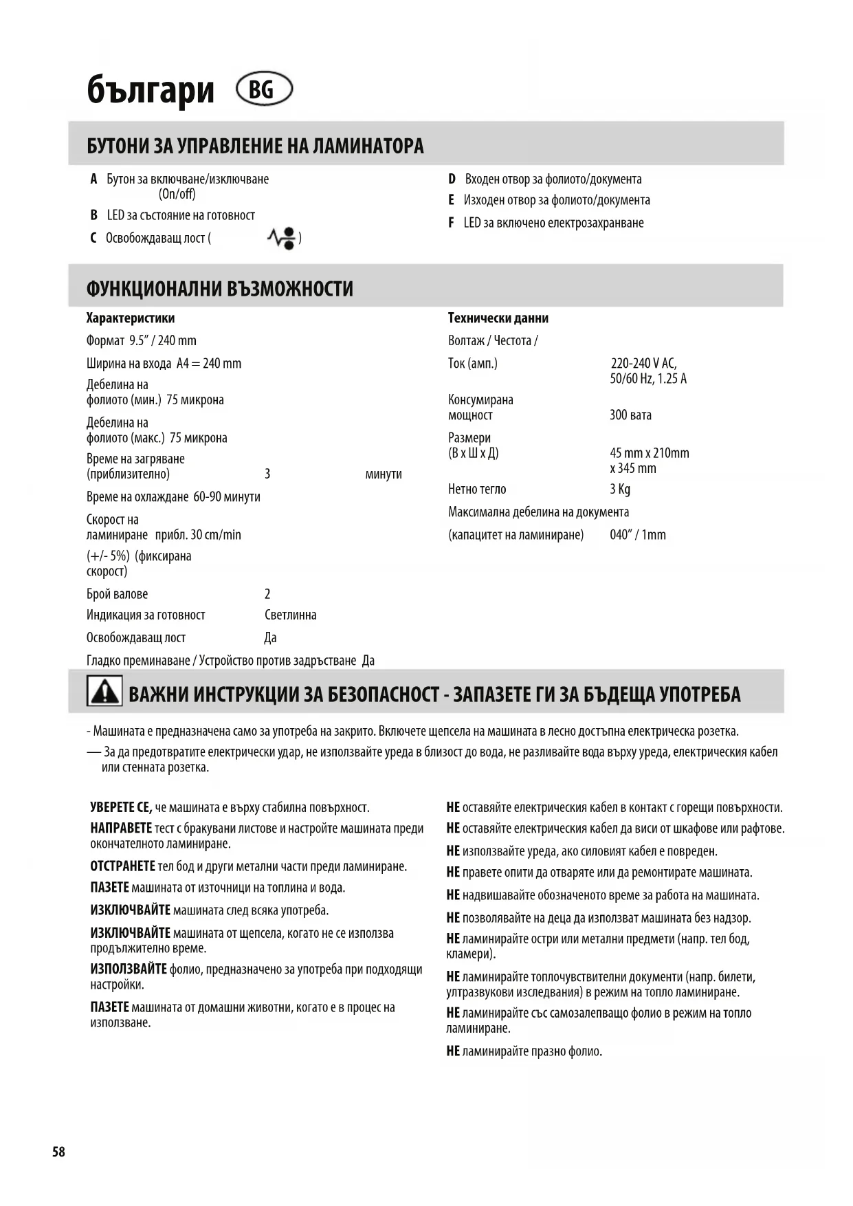 D Входен отвор за фолиото/документа E Изходен отвор за фолиото/документа F LED за включено електрозахранване ФУНКЦИОНАЛНИ ВЪЗМОЖНОСТИ Характеристики Формат 9.5” / 240 mm Ширина на входа A4 = 240 mm Дебелина на фолиото (мин.) 75 микрона Дебелина на фолиото (макс.) 75 микрона Време на загряване (приблизително) 3 минути Време на охлаждане 60-90 минути