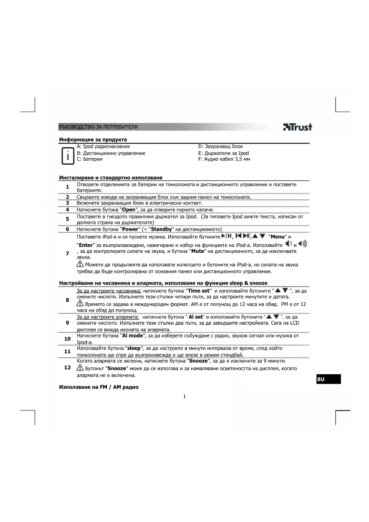 Информация за продукта A: Ipod радиочасовник B: Дистанционно управление C: Батерии D: Захранващ блок E: Държатели за Ipod F: Аудио кабел 3,5 мм Инсталиране и стандартно използване