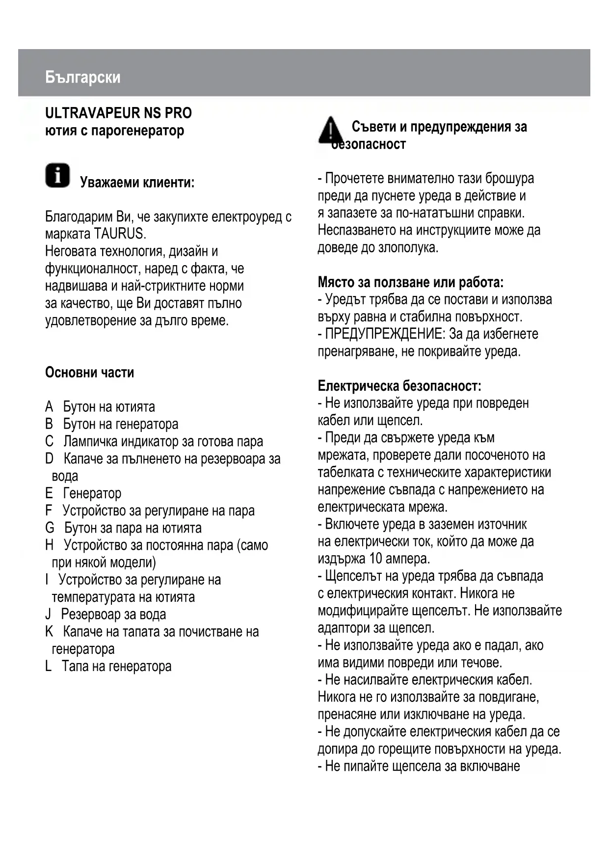 ютия с парогенератор Уважаеми клиенти: Благодарим Ви, че закупихте електроуред с марката TAURUS. Неговата технология, дизайн и функционалност, наред с факта, че надвишава и най-стриктните норми за качество, ще Ви доставят пълно удовлетворение за дълго време. Основни части A Бутон на ютията B Бутон на генератора C Лампичка индикатор за готова пара D Капаче за пълненето на резервоара за