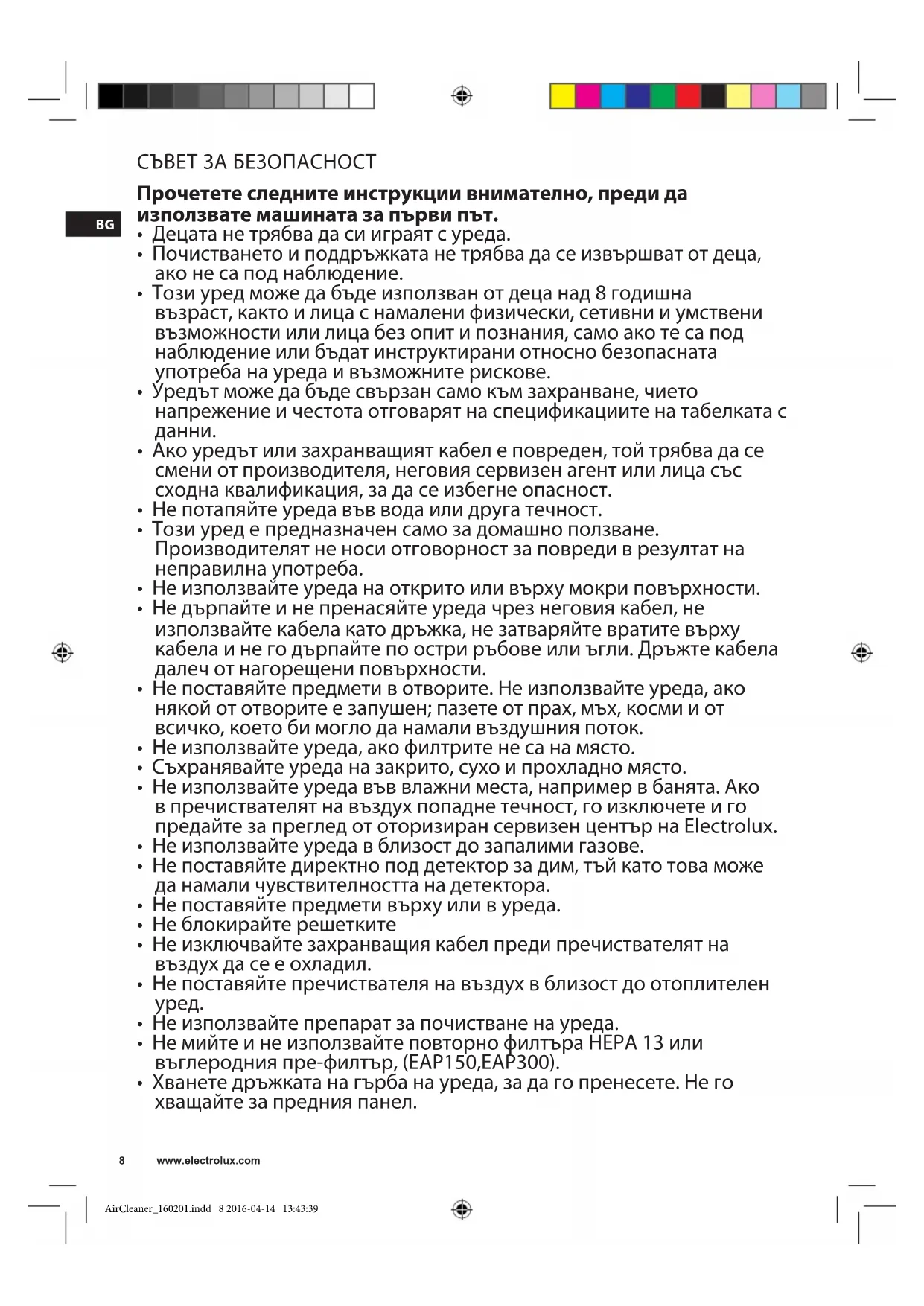 EAP1503. Извадете филтъра HEPA 13 и въглеродния пре-филтър от пластмасовата обвивка.4. Инсталирайте филтъра HEPA 13 така, че стрелката показваща “air ow” (въздушен поток) да сочи към задната част на пречиствателя на въздух; белите раздели в горната и долната част на филтъра HEPA 13 ще сочат към предната част на уреда.5. Инсталирайте въглеродния пре-филтър пред филтъра HEPA 13.6. Сменете предния филтър, като закачите панела в горната част на уреда. Завъртете панела чрез леко натискане върху всяка странана уреда и след това го фиксирайте на едно място ■ ■ ■ EAP3003. Извадете филтъра HEPA 13 и въглеродния пре-филтър от пластмасовата обвивка.4. Инсталирайте филтъра HEPA 13 така, че стрелката показваща “air ow” (въздушен поток) да сочи към задната част на пречиствателя на въздух; белите раздели в горната и долната част на филтъра HEPA 13 ще сочат към предната част на уреда.5. Монтирайте въглеродния пре-филтър към пластмасовата рамка чрез притискане към всички текстилни велкро квадратчета на гърба на рамката6. Монтирайте пластмасовата рамка чрез вмъкване на разделите в пречиствателя на въздух и леко притиснете навътре в долния раздел, докато рамката внимателно пасне на място. Сменете предния филтър, като закачите панела в горната част на уреда. Завъртете панела чрез леко натискане върху всяка страна на уреда и след това го фиксирайте на едно място. ■ ■ ■ EAP4503. Извадете филтърната касета и махнете пластмасовата обвивка от нея.4. Монтирайте филтърната касета чрез вмъкване на разделите в пречиствателя на въздух и леко притиснете навътре в долния раздел, докато рамката пасне на място.5. Сменете предния филтър, като закачите панела в горната част на уреда.6. Завъртете панела чрез леко натискане върху всяка страна на уреда и след това го фиксирайте на едно място. EAP150, EAP300, EAP4507. Включете захранващия кабел в електрическия контакт.8. Натиснете и задръжте бутона за захранването, докато не се чуе кратък звуков сигнал.9. Нужни са около 3-4 минути, за да може пречиствателя на въздух да калибрира сензора за качество на въздуха. През това време лампичките на сензора започват да мигат. ■ ■ ■ EAP300, EAP45010. когато сензорът е калибриран, светлините преминават в режим “AUTo” (автоматичен). www.electrolux.com