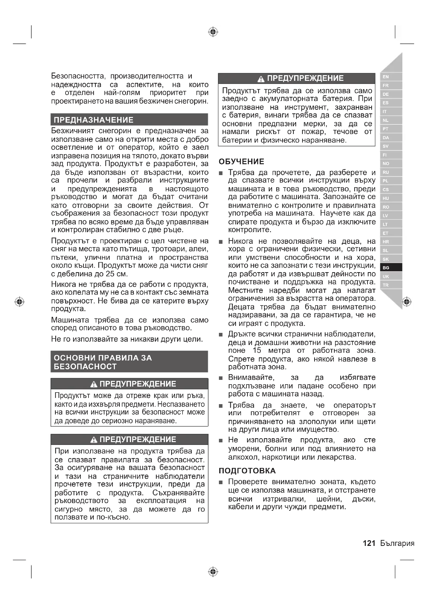 Безопасността, производителността и надеждността са аспектите, на които е отделен най-голям приоритет при проектирането на вашия безжичен снегорин. ПРЕДНАЗНАЧЕНИЕ Безжичният снегорин е предназначен за използване само на открити места с добро осветление и от оператор, който е заел изправена позиция на тялото, докато върви зад продукта. Продуктът е разработен, за да бъде използван от възрастни, които са прочели и разбрали инструкциите и предупрежденията в настоящото ръководство и могат да бъдат