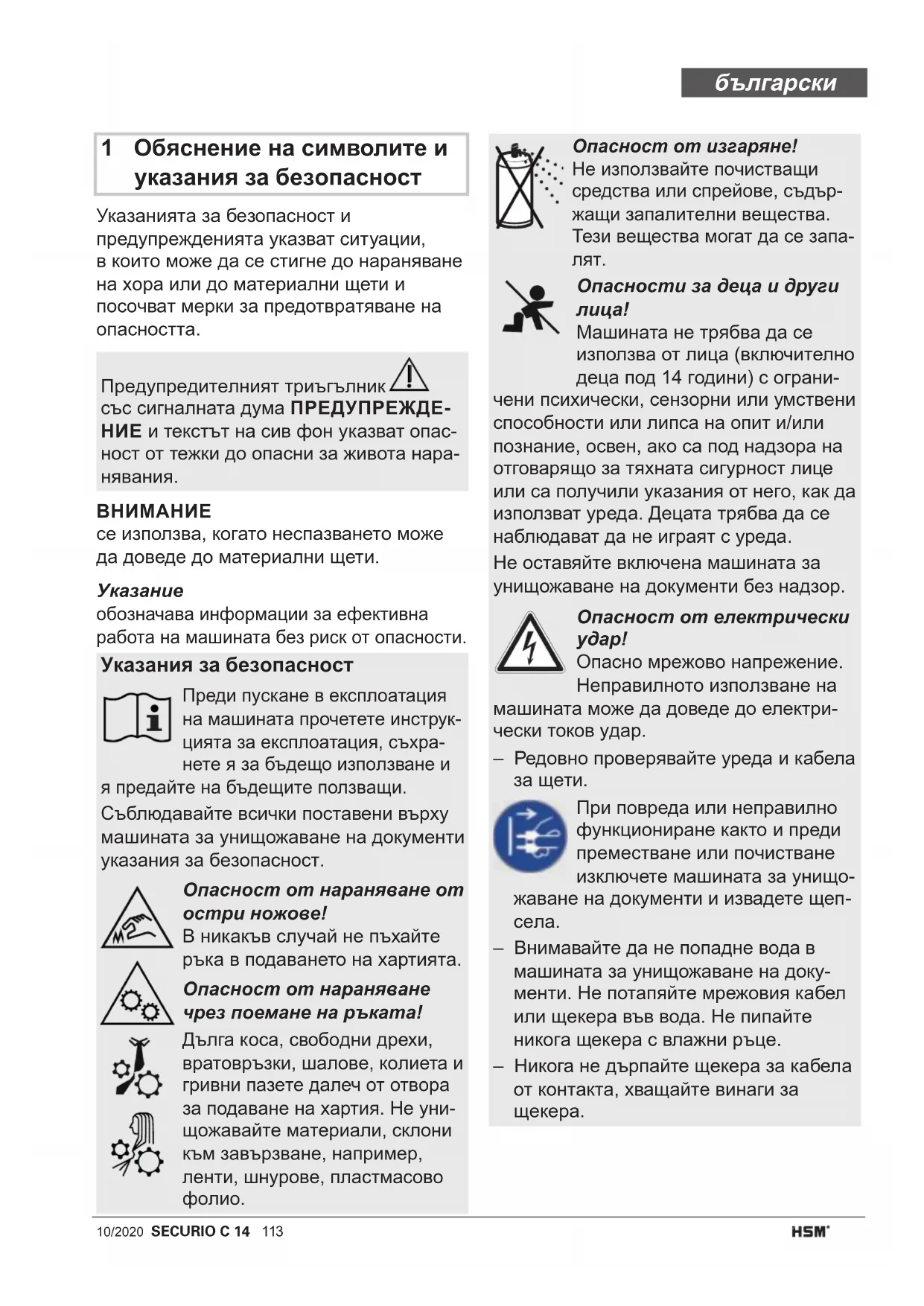 се използва, когато неспазването може да доведе до материални щети. Указания за безопасност Преди пускане в експлоатация на машината прочетете инструк- цията за експлоатация, съхра- нете я за бъдещо използване и я предайте на бъдещите ползващи. Съблюдавайте всички поставени върху машината за унищожаване на документи указания за безопасност. Опасност от нараняване от остри ножове! В никакъв случай не пъхайте ръка в подаването на хартията. Опасност от нараняване чрез поемане на ръката! Дълга коса, свободни дрехи, вратовръзки, шалове, колиета и гривни пазете далеч от отвора за подаване на хартия. Не уни- щожавайте материали, склони към завързване, например, ленти, шнурове, пластмасово