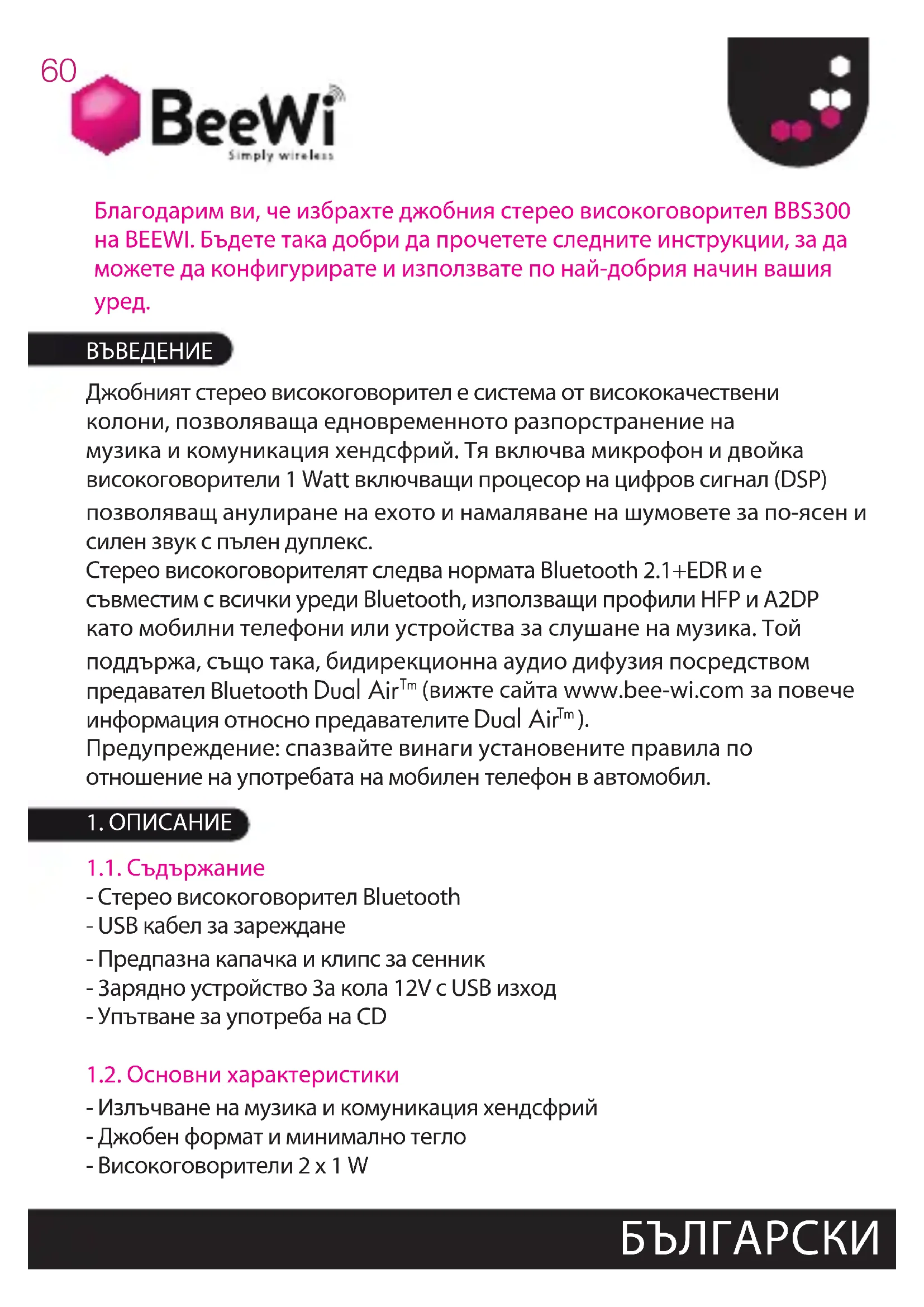 Благодарим ви, че избрахте джобния стерео високоговорител BBS300 на BEEWI. Бъдете така добри да прочетете следните инструкции, за да можете да конфигурирате и използвате по най-добрия начин вашия
