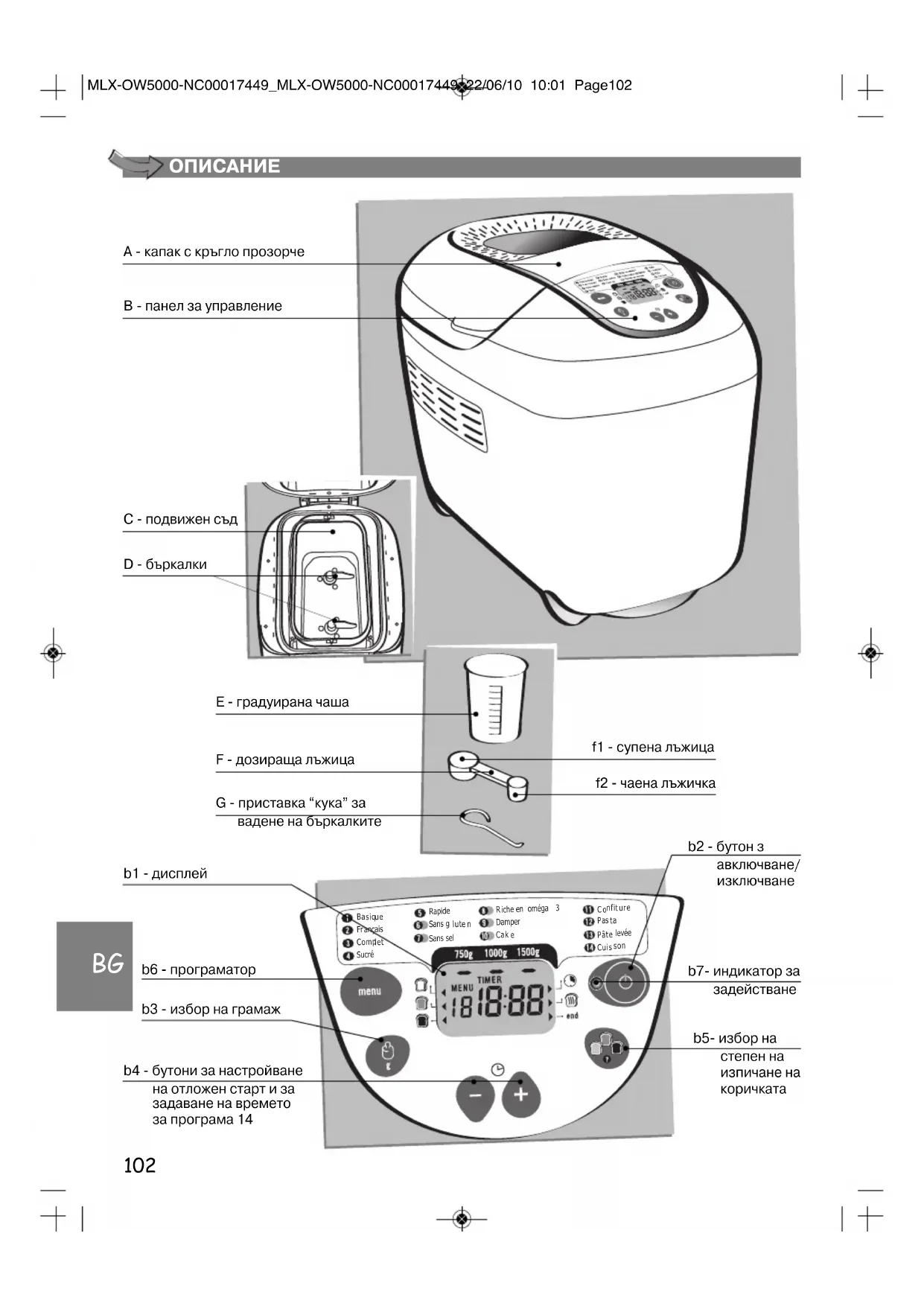 B - панел за управление C - подвижен съд D - бъркалки E - градуирана чаша F - дозираща лъжица f1 - супена лъжица f2 - чаена лъжичка G - приставка “кука” за вадене на бъркалките MLX-OW5000-NC00017449_MLX-OW5000-NC00017449 22/06/10 10:01 Page102103