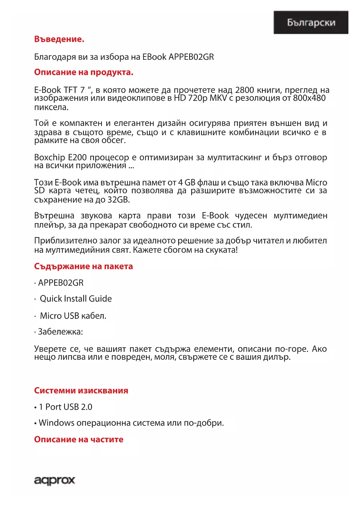 APPEB02GR - електронен четец Approx - Безплатно ръководство за потребителя