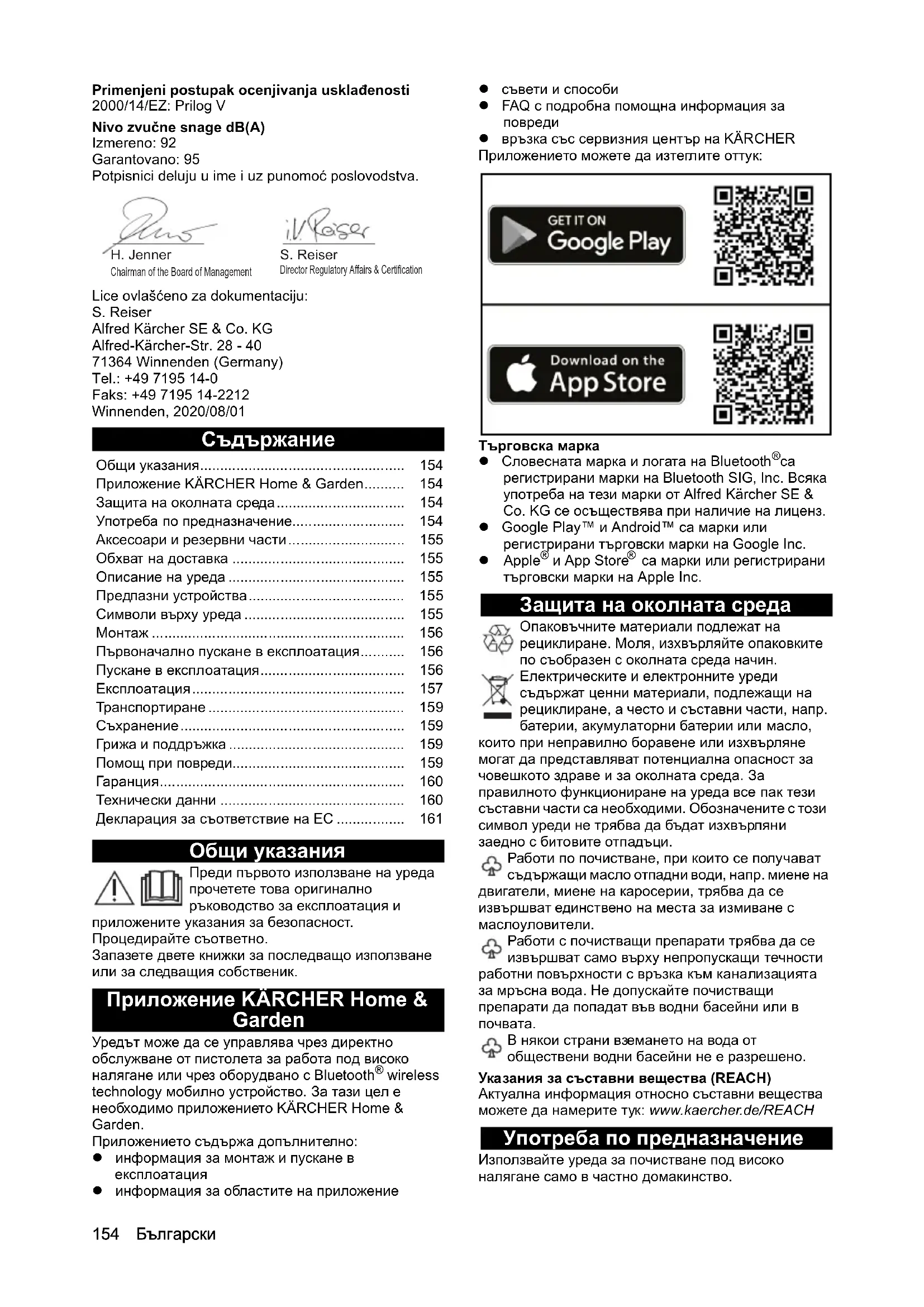 Общи указания Преди първото използване на уреда прочетете това оригинално ръководство за експлоатация и приложените указания за безопасност. Процедирайте съответно. Запазете двете книжки за последващо използване или за следващия собственик. Приложение KÄRCHER Home & Garden Уредът може да се управлява чрез директно обслужване от пистолета за работа под високо налягане или чрез оборудвано с Bluetooth