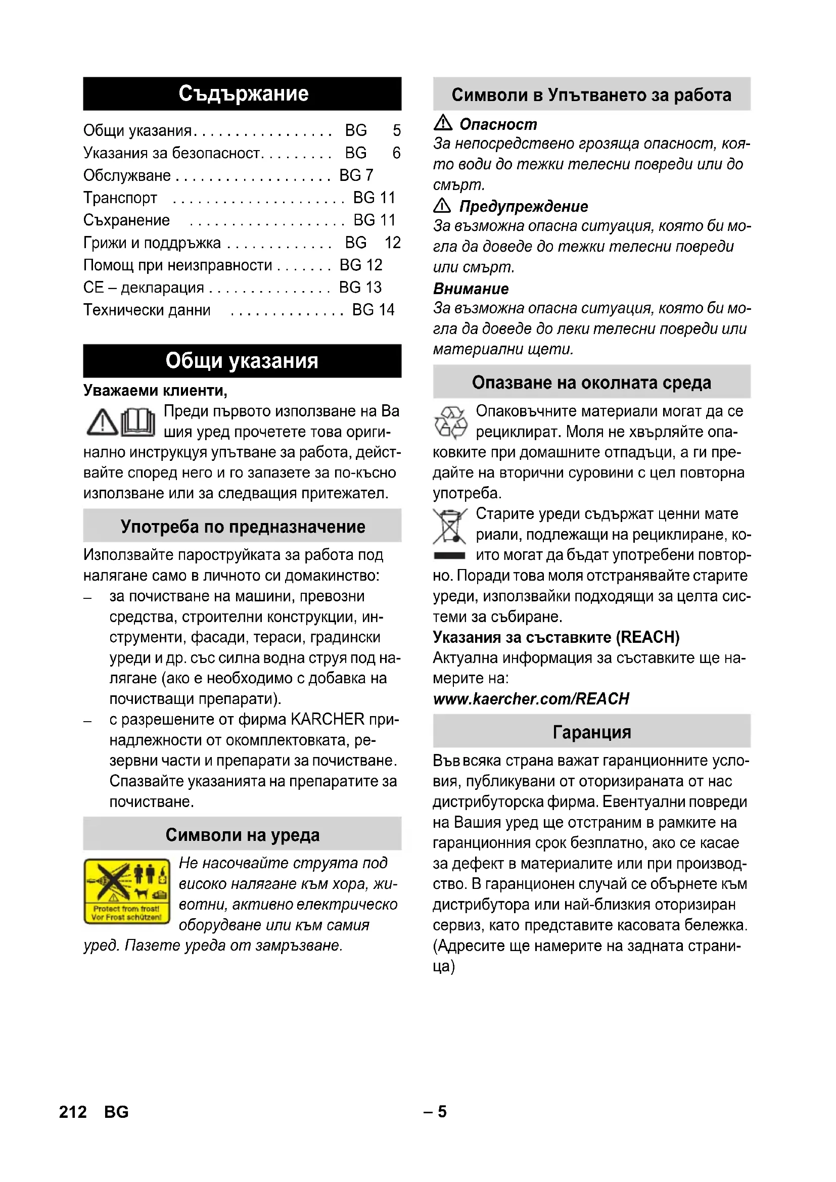 с разрешените от фирма KARCHER при- надлежности от окомплектовката, ре- зервни части и препарати за почистване. Спазвайте указанията на препаратите за почистване. Не насочвайте струята под високо налягане към хора, жи- вотни, активно електрическо оборудване или към самия уред. Пазете уреда от замръзване.