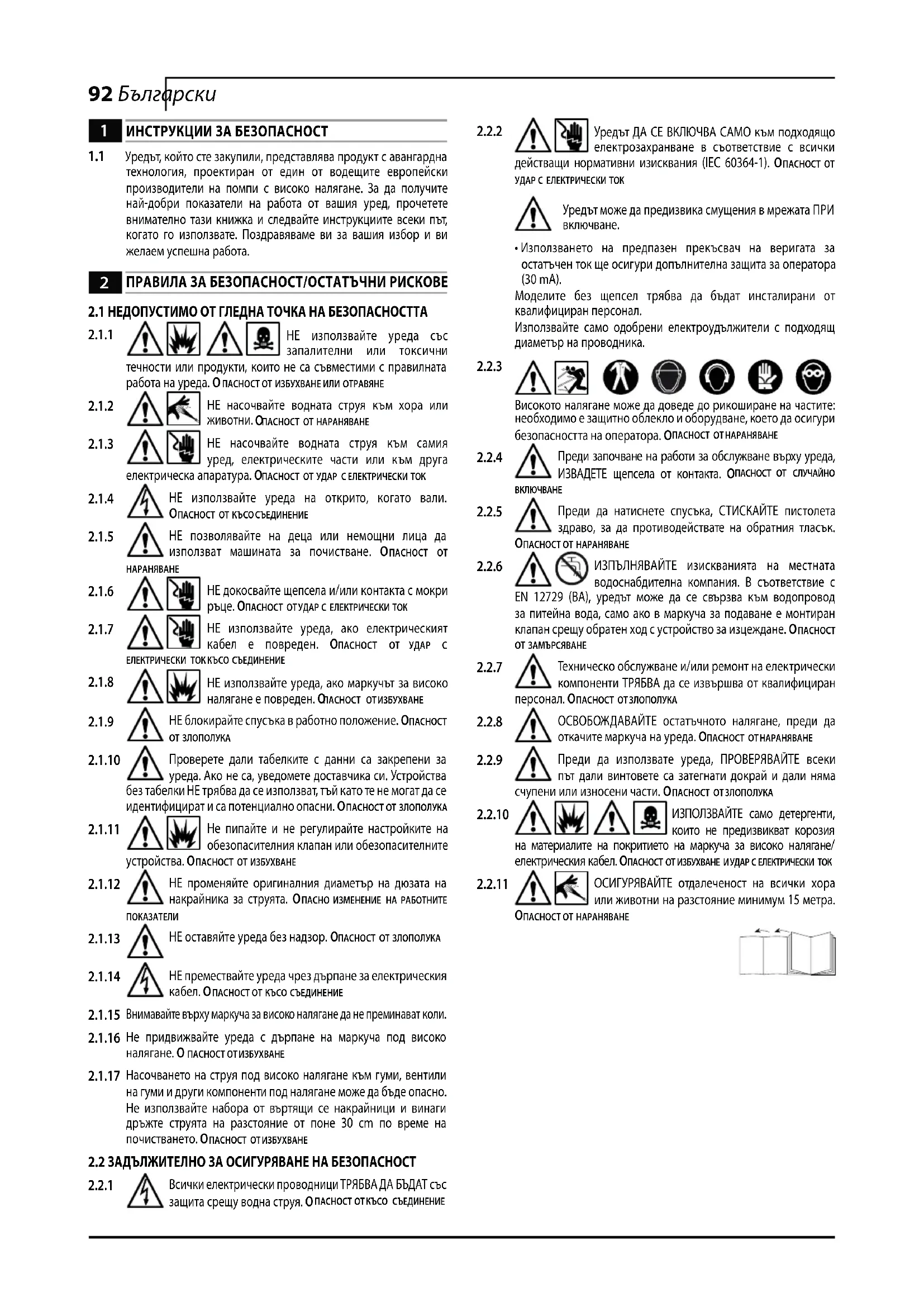 Този уред е предназначен за индивидуална употреба за почистване на автомобили, машини, лодки, стени и др., с цел отстраняване на упорити замърсявания, като използва чиста вода и биоразграждащи се химически детергенти. Двигатели на автомобили могат да се почистват само ако се използва непитейна вода в съответствие с действащата нормативна уредба. - Температура на поеманата вода: виж табелката с технически данни - Налягане на поеманата вода: под 10 бара. - Смукателно налягане за вода: мин. 0,1MPa-макс. 1MPa. Уредът съответства на стандарт EN 60335-2-79/A1.