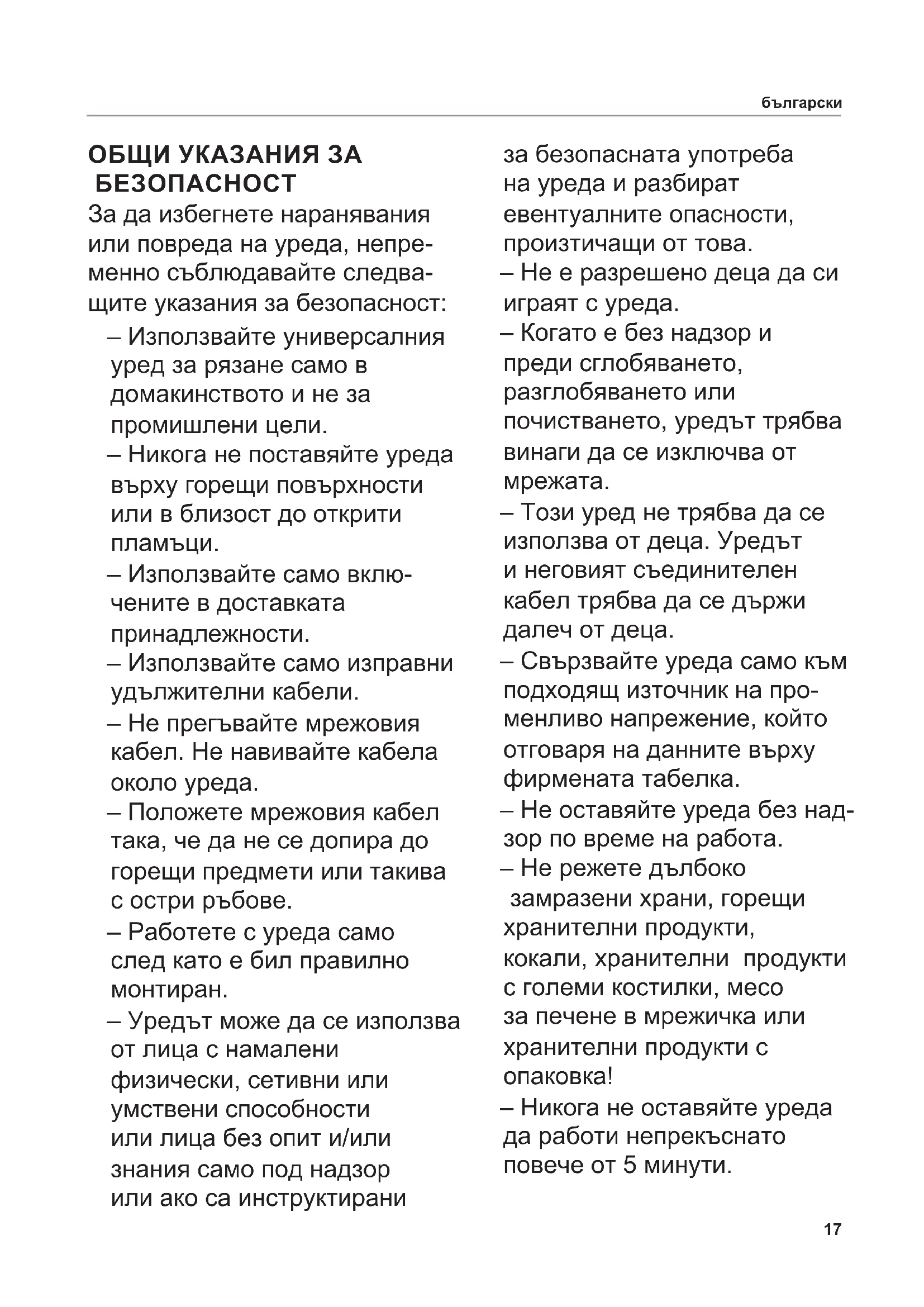 – Този уред не трябва да се използва от деца. Уредът и неговият съединителен кабел трябва да се държи далеч от деца. – Свързвайте уреда само към подходящ източник на про- менливо напрежение, който отговаря на данните върху фирмената табелка. – Не оставяйте уреда без над- зор по време на работа. – Не режете дълбоко замразени храни, горещи хранителни продукти, кокали, хранителни продукти с големи костилки, месо за печене в мрежичка или хранителни продукти с