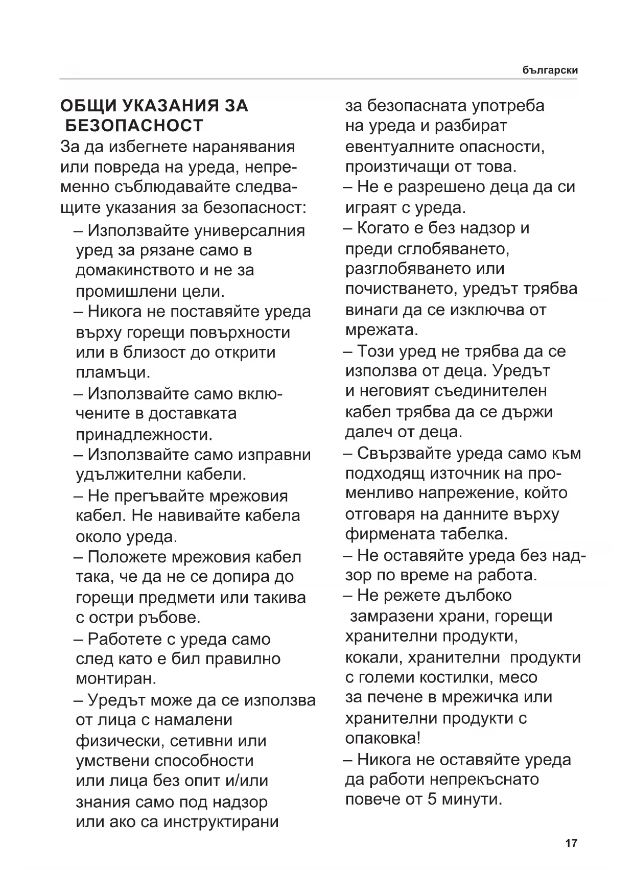 – Този уред не трябва да се използва от деца. Уредът и неговият съединителен кабел трябва да се държи далеч от деца. – Свързвайте уреда само към подходящ източник на про- менливо напрежение, който отговаря на данните върху фирмената табелка. – Не оставяйте уреда без над- зор по време на работа. – Не режете дълбоко замразени храни, горещи хранителни продукти, кокали, хранителни продукти с големи костилки, месо за печене в мрежичка или хранителни продукти с