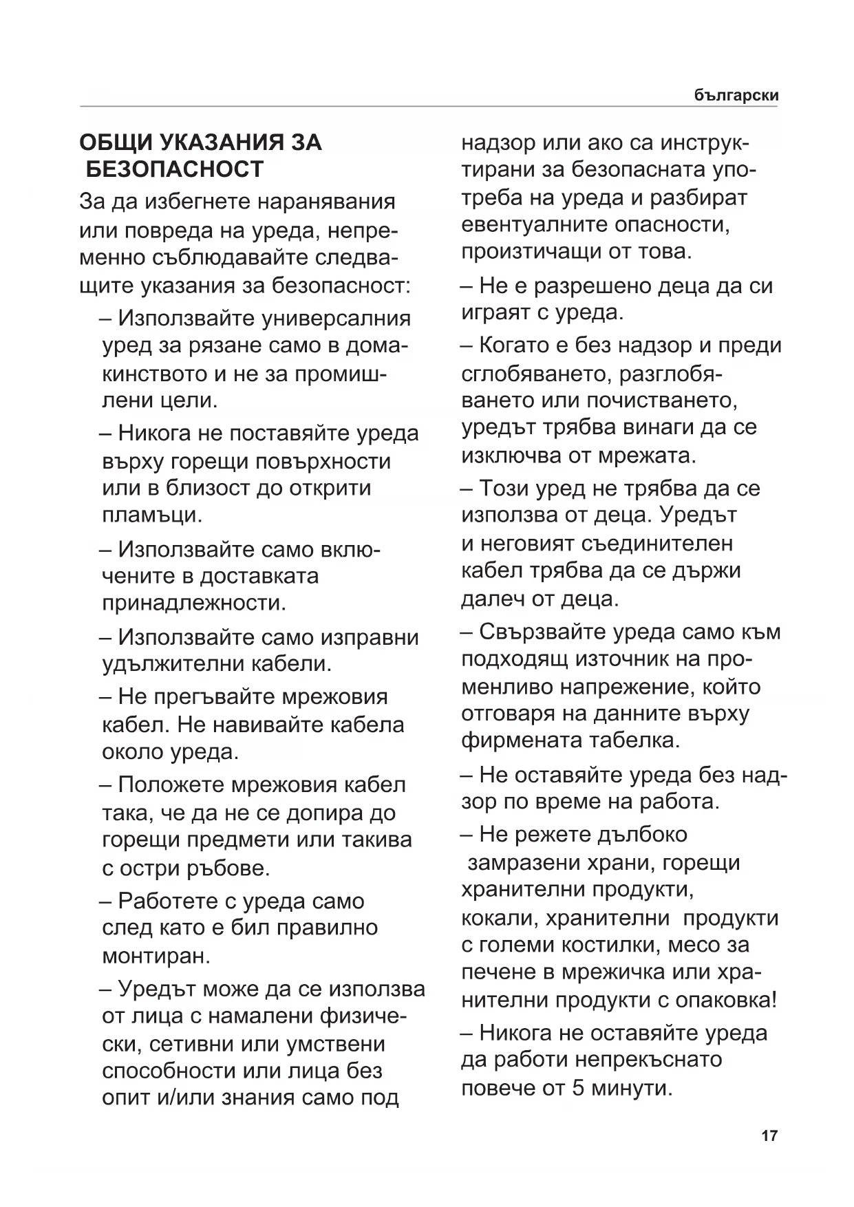 – Уредът може да се използва от лица с намалени физиче- ски, сетивни или умствени способности или лица без опит и/или знания само под надзор или ако са инструк- тирани за безопасната упо- треба на уреда и разбират евентуалните опасности, произтичащи от това. – Не е разрешено деца да си играят с уреда. – Когато е без надзор и преди сглобяването, разглобя- ването или почистването, уредът трябва винаги да се изключва от мрежата. – Този уред не трябва да се използва от деца. Уредът и неговият съединителен кабел трябва да се държи далеч от деца. – Свързвайте уреда само към подходящ източник на про- менливо напрежение, който отговаря на данните върху фирмената табелка. – Не оставяйте уреда без над- зор по време на работа. – Не режете дълбоко замразени храни, горещи хранителни продукти, кокали, хранителни продукти с големи костилки, месо за печене в мрежичка или хра- нителни продукти с опаковка! – Никога не оставяйте уреда да работи непрекъснато повече от 5 минути.18 Опасност от токов удар – При аварии, преди всяко почистване и когато уредът не се ползва, винаги изваж- дайте мрежовия щепсел от контакта. При това издърп- вайте за щепсела, а не за