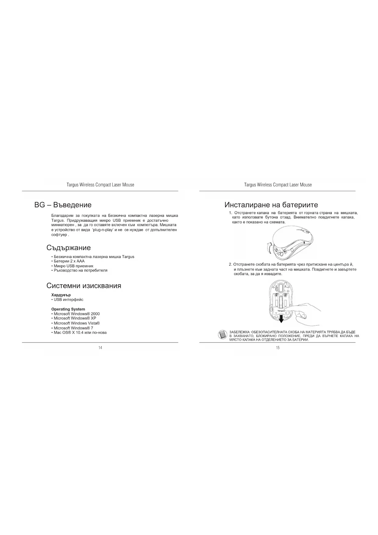 BG – Въведение Благодарим за покупката на Безжична компактна лазерна мишка Targus. Придружаващия микро USB приемник е достатъчно миниатюрен , за да го оставяте включен към компютъра. Мишката е устройство от вида ‘plug-n-play’ и не се нуждае от допълнителен