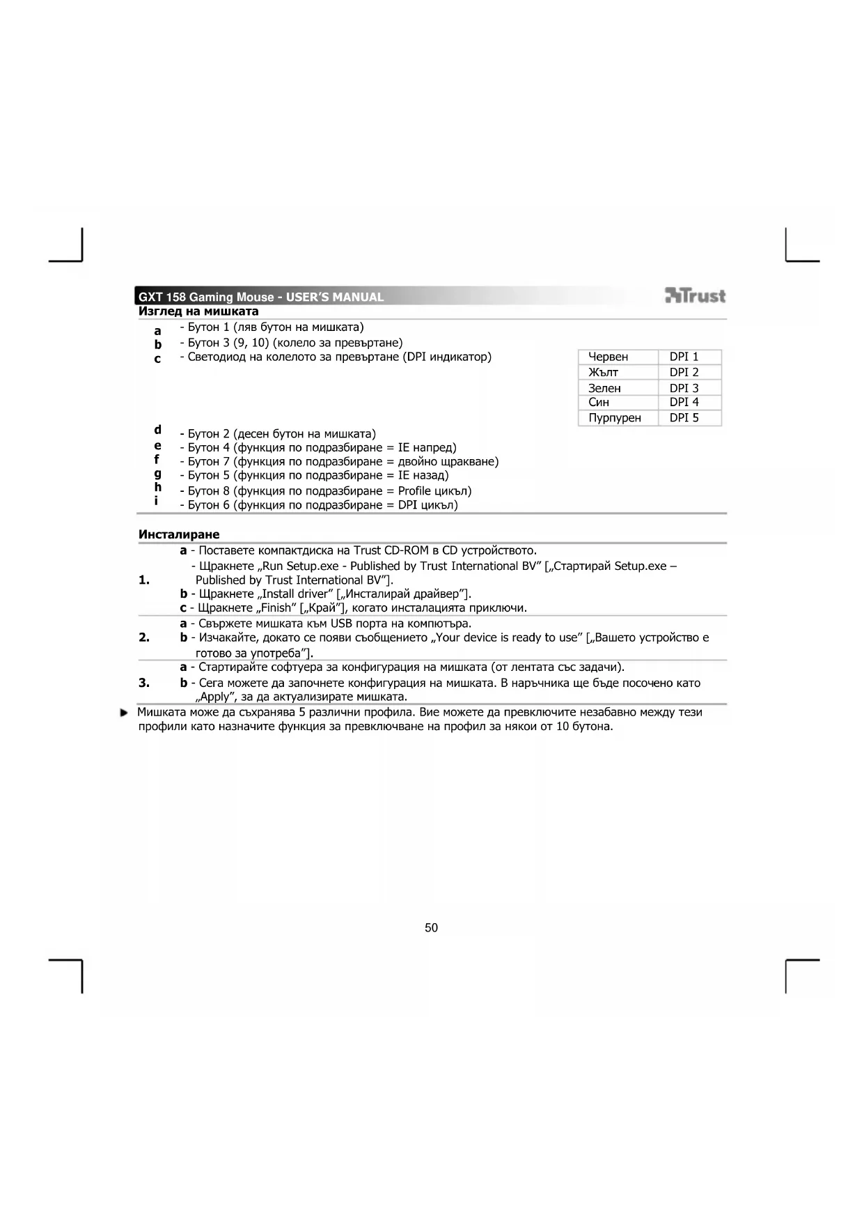 a - Поставете компактдиска на Trust CD-ROM в CD устройството. - Щракнете „Run Setup.exe - Published by Trust International BV” [„Стартирай Setup.exe – Published by Trust International BV”]. b - Щракнете „Install driver” [„Инсталирай драйвер”]. c - Щракнете „Finish” [„Край”], когато инсталацията приключи.