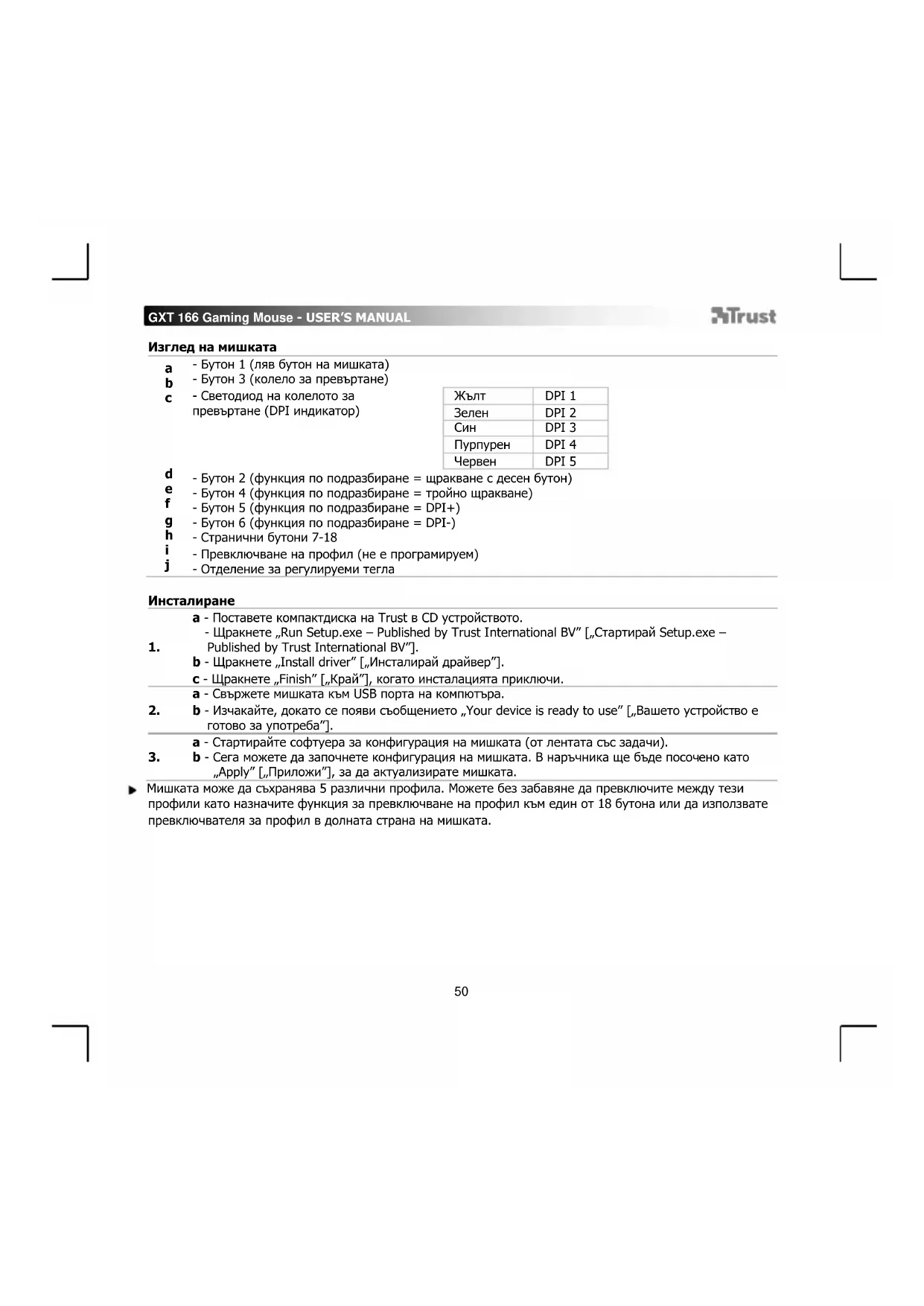 a - Поставете компактдиска на Trust в CD устройството. - Щракнете „Run Setup.exe – Published by Trust International BV” [„Стартирай Setup.exe – Published by Trust International BV”]. b - Щракнете „Install driver” [„Инсталирай драйвер”]. c - Щракнете „Finish” [„Край”], когато инсталацията приключи.