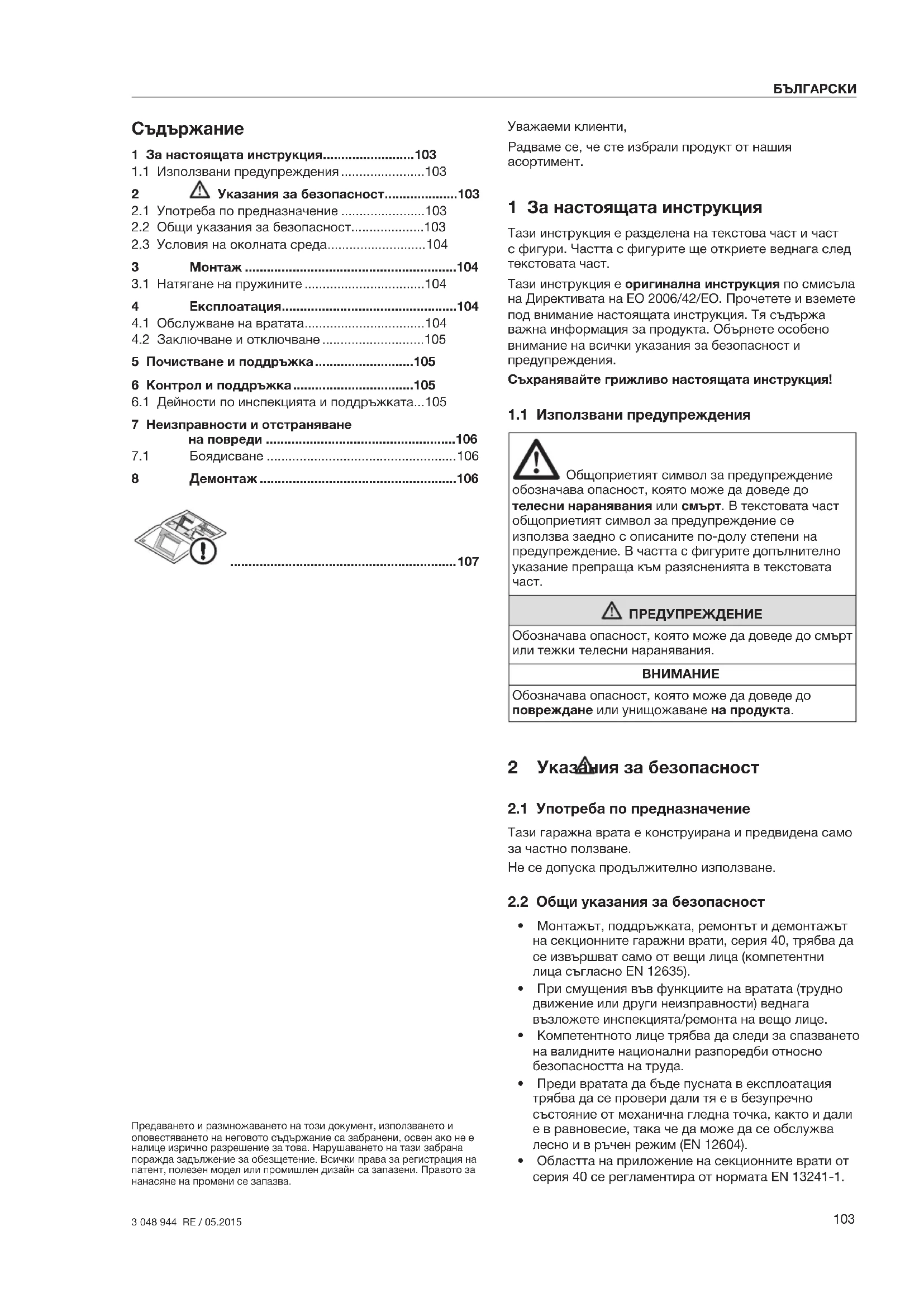 - Областта на приложение на секционните врати от серия40 се регламентира от нормата EN13241-1. 1 За настоящата инструкция ......................... 103