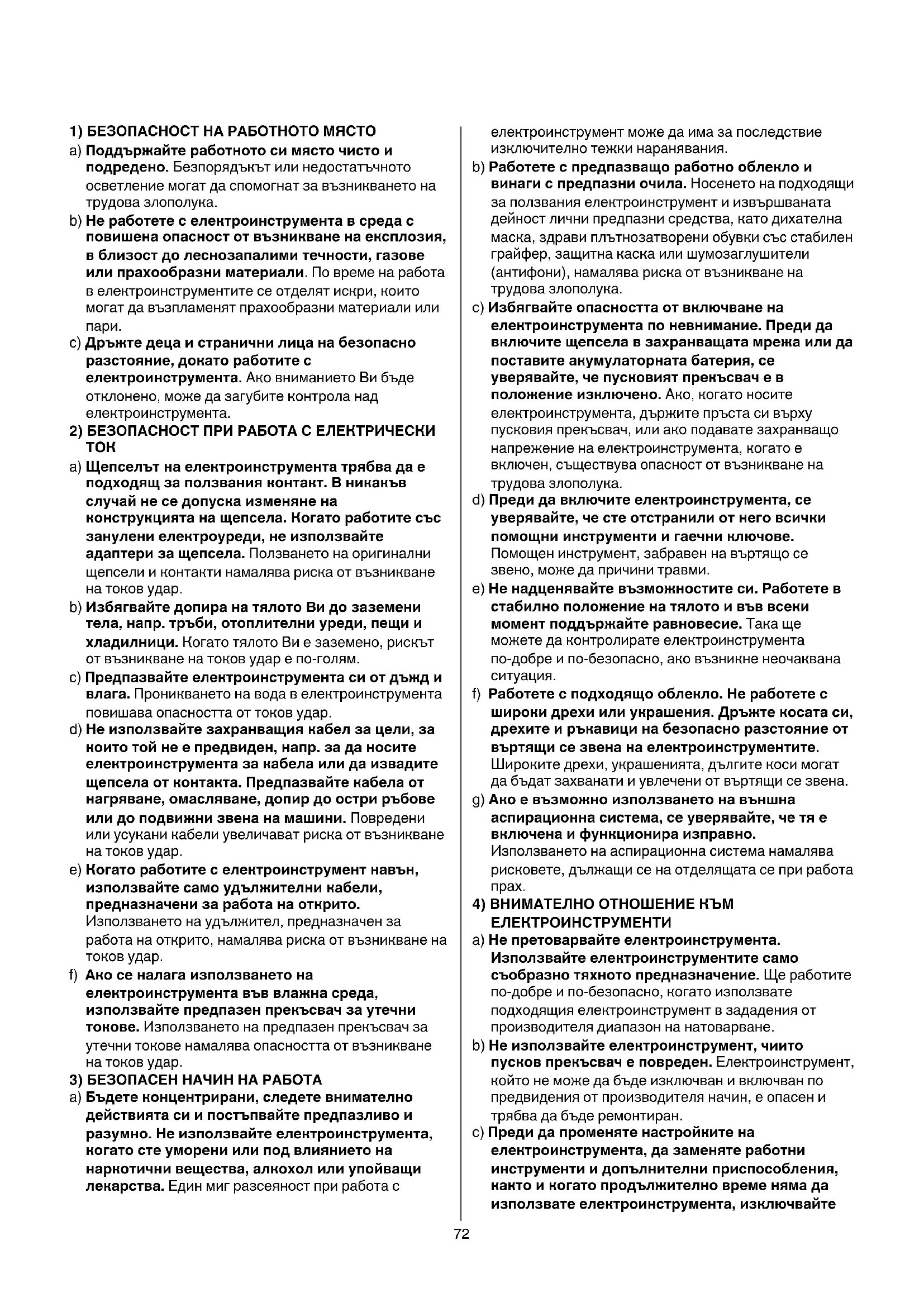 - НЕ Е ВКЛЮЧЕНА СТАНДАРТНО БЕЗОПАСНОСТ ОБЩИУКАЗАНИЯЗАБЕЗОПАСНАРАБОТА ВНИМАНИЕ!Прочететевнимателновсички указания. Неспазването на приведените по долу указания може да доведе до токов удар, пожар и/или тежки травми. Съхранявайтетезиуказанияна сигурномясто. Използваният по-долу термин “електроинструмент” се отнася до захранвани от електрическата мрежа електроинструменти (със захранващ кабел) и до захранвани от акумулаторна батерия електроинструменти (без захранващ кабел).72 1)БЕЗОПАСНОСТНАРАБОТНОТОМЯСТО a) Поддържайтеработнотосимясточистои подредено. Безпорядъкът или недостатъчното осветление могат да спомогнат за възникването на трудова злополука. b) Неработетеселектроинструментавсредас повишенаопасностотвъзникваненаексплозия, вблизостдолеснозапалимитечности,газове илипрахообразниматериали. По време на работа в електроинструментите се отделят искри, които могат да възпламенят прахообразни материали или
