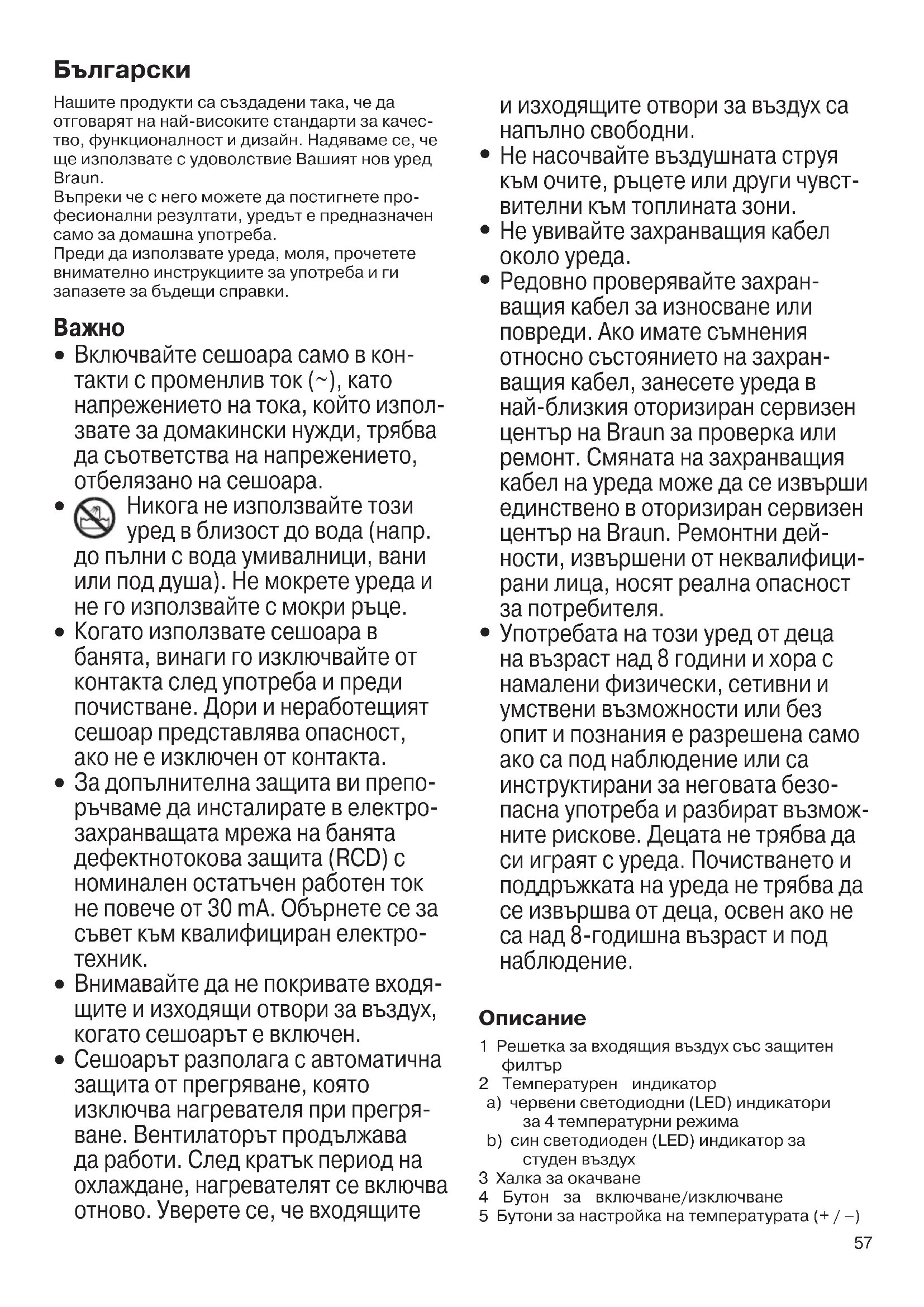 Нашите продукти са създадени така, че да отговарят на най-високите стандарти за качес- тво, функционалност и дизайн. Надяваме се, че ще използвате с удоволствие Вашият нов уред Braun. Въпреки че с него можете да постигнете про- фесионални резултати, уредът е предназначен само за домашна употреба. Преди да използвате уреда, моля, прочетете внимателно инструкциите за употреба и ги запазете за бъдещи справки.