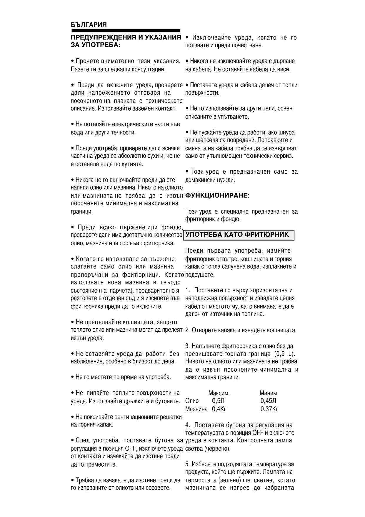 - икога не го включвайте преди да сте наляли олио или мазнина. ивото на олиото или мазнината не трябва да е извън посочените минимална и максимална