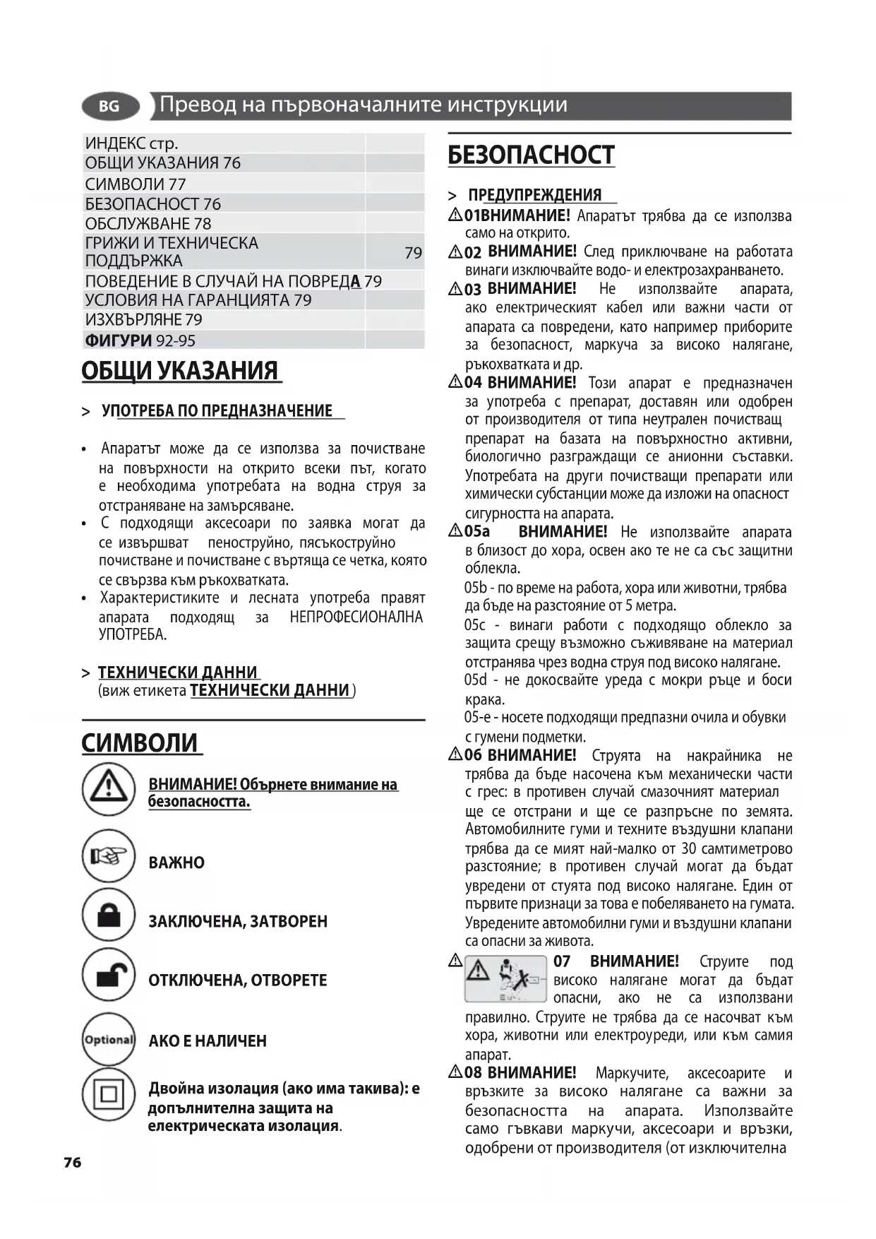 - ВНИмАНИЕ! Ръкохватката е оборудвана с предпазна блокировка. Важно е всеки път, когато се прекъсне работата с апарата, да се включи блокировката за безопасност за избягване на случайни включвания. - Прибори за безопасност: ръкохватка с блокировка за безопасност, апарат, оборудван със защита от ел. претоварване (Кл. I), помпа, оборудвана с байпас или прибор за изключване. - Бутонът за безопасност на ръкохватката не служи за блокиране на спусъка по време на работа, а за избягване на случайни включвания.