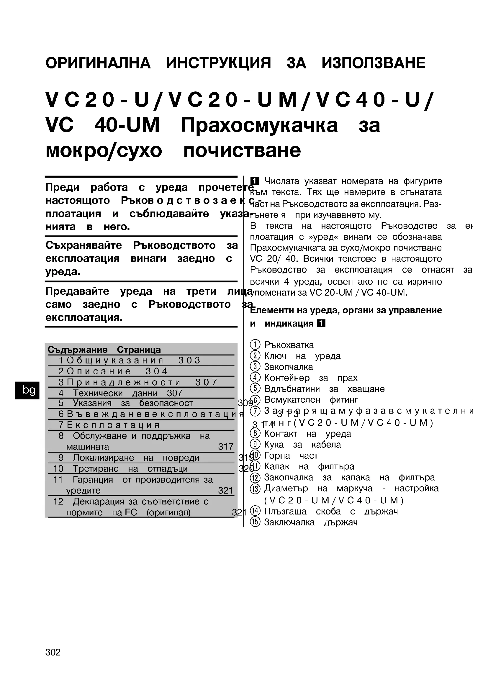 Предавайте уреда на трети лица само заедно с Ръководството за експлоатация. Съдържание Страница1Общиуказания 3032Описание 3043Принадлежности 3074 Технически данни 3075 Указания за безопасност 3096Въвежданевексплоатация 3137Експлоатация 3148 Обслужване и поддръжка намашината 3179 Локализиране на повреди 31910 Третиране на отпадъци 32011 Гаранция от производителя зауредите 32112 Декларация за съответствие снормите на ЕС (оригинал) 321 1 Числата указват номерата на фигурите към текста. Тях ще намерите в сгънатата част на Ръководството за експлоатация. Раз- гънете я при изучаването му.В текста на настоящото Ръководство за екс- плоатация с »уред« винаги се обозначава Прахосмукачката за сухо/мокро почистване VC 20/ 40. Всички текстове в настоящото Ръководство за експлоатация се отнасят за всички 4 уреда, освен ако не са изрично упоменатизаVC20‑UM/VC40‑UM. Елементи на уреда, органи за управление и индикация 1